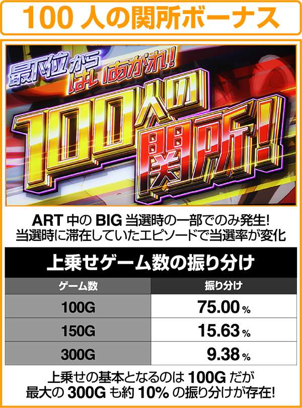 基本的にART中にゲーム数の直乗せはおこなわれないが、ART中のBIGで数種類あるエピソードのなかから100人の関所!が選ばれた場合は100G以上の上乗せが確定する。