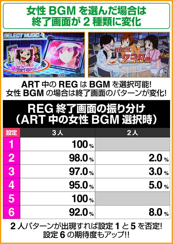 女性BGMを選択した場合は終了画面のパターンが変化し、振り分けも変化する。 オールスター終了画面と女性2人の終了画面が出現したら設定6が確定するなど、2パターンを組み合わせることによって設定判別の精度が上がることだろう。