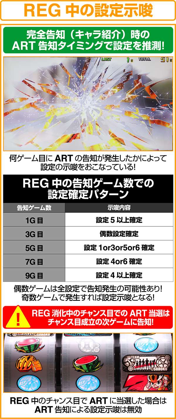 REG成立時やREG中にもARTの抽選をおこなっているため、5回以内にARTに当選したからといった高設定を否定するわけではない。
