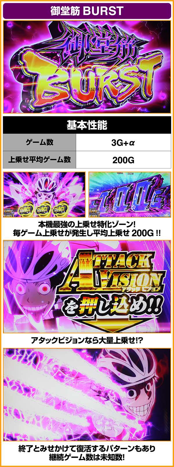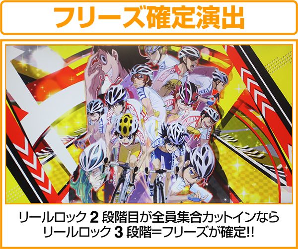 大人気『TVアニメーション弱虫ペダル』がボーナス+ARTのパチスロとして登場。 ART「ハイケイデンスロード」は1Gあたりの純増約1.9枚(ボーナス込み)、ボーナスを契機に突入。上乗せ特化ゾーンは3種類あり、「御堂筋BURST」なら大量上乗せの大チャンスだ。ART終了後に必ず突入する「あきらめない心ゾーン」は引き戻し期待度が約44%と、最後まで「まだやれる!」と思える仕様になっている。 |