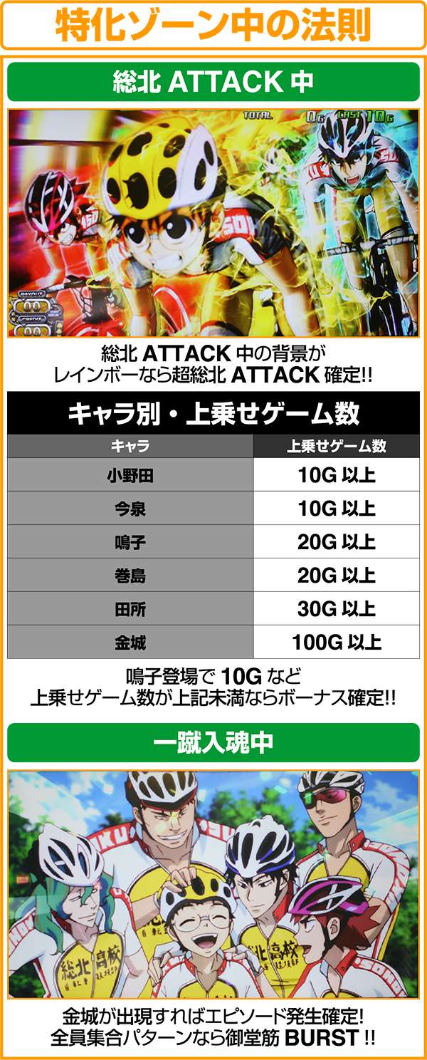 BIG中やART中の逆押しギア揃い成立時は特化ゾーンの総北ATTACKもしくは御堂筋BURSTをストックする。