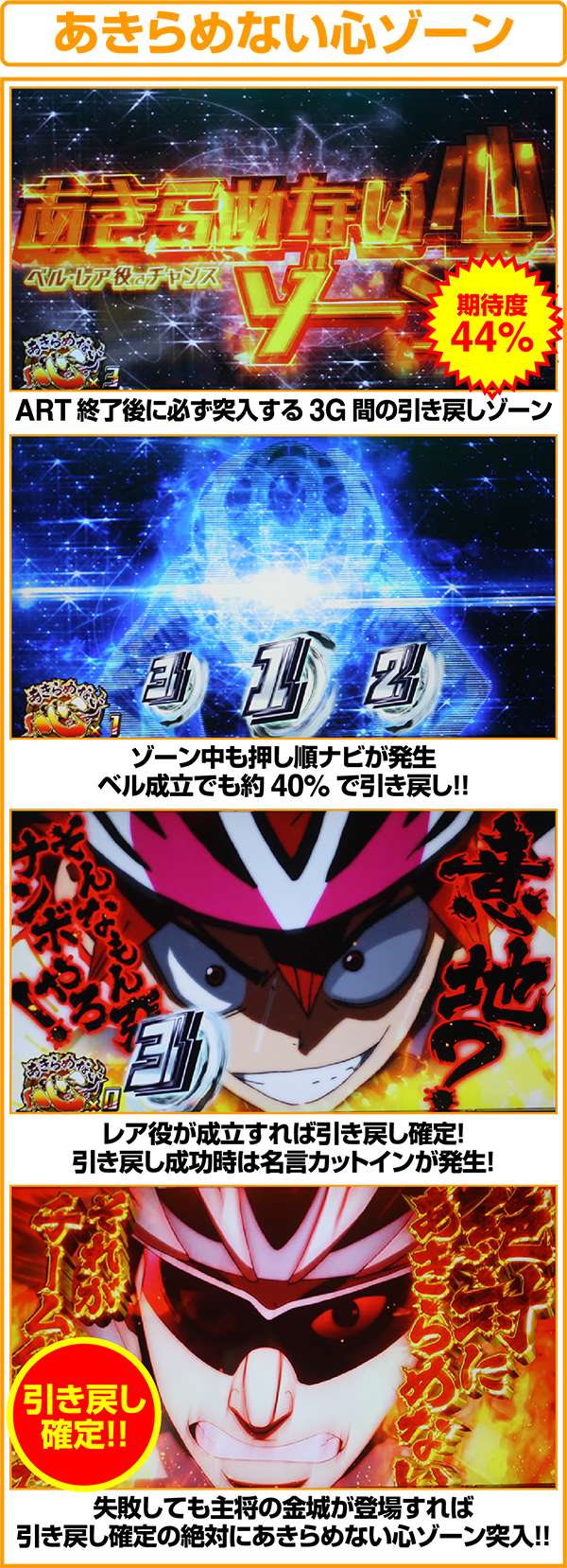絶対にあきらめない心ゾーン自体に継続率の概念が存在。引き戻し当選時に継続の抽選をおこない、その抽選に漏れるまで上乗せをストックし続ける。さらにボーナス当選時はエピソードRIDEのストックが確定するなど、突入した時点で大チャンスとなっている。