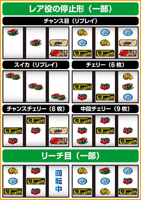 スイカとチャンス目はともにリプレイのため取りこぼしても損をすることはないが、当選契機を正確に見抜くためにも中右リールは赤7を目安にスイカを狙っておこう。