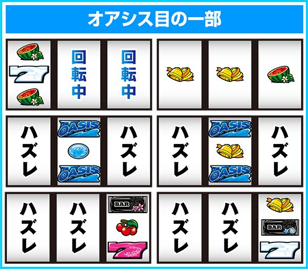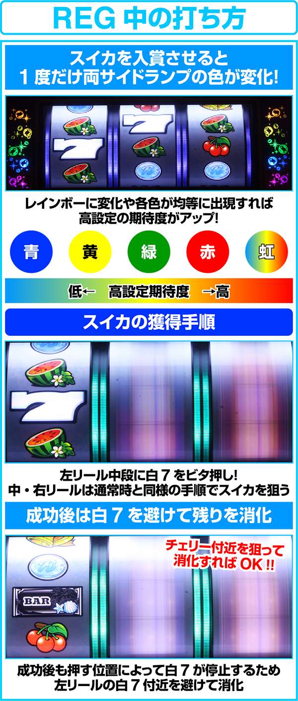 また、スイカを入賞させたあとはフリー打ちでOKだが、左リール中段に白7を止めてしまうと中・右リールにも目押しをする必要がある。適当に押すと取りこぼしてしまう可能性があるため、左リールは白7を避けて消化するようにしよう。