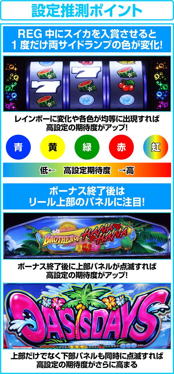 2017年におけるパイオニアの第1弾 として「オアシスデイズ」が登場する。 ゲーム性はシリーズおなじみの王道Aタイプとなっており、スペック面は兄弟機ともいえるキングハナハナを継承・進化。発生するタイミングで期待度が異なるバウンドストップの存在やボーナス中の設定示唆要素はシリーズ初の色での設定示唆に変化していることなど、幅広いプレイヤーが楽しめる仕様となっている。 |