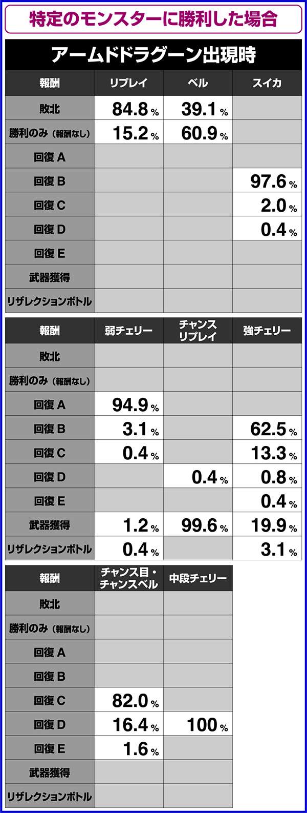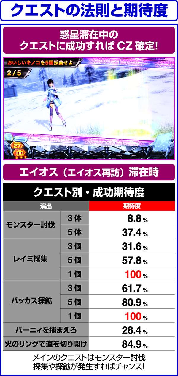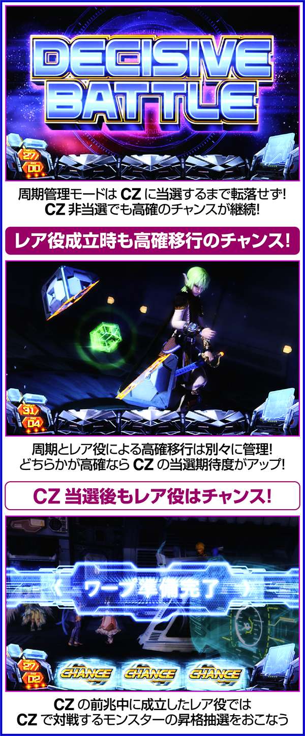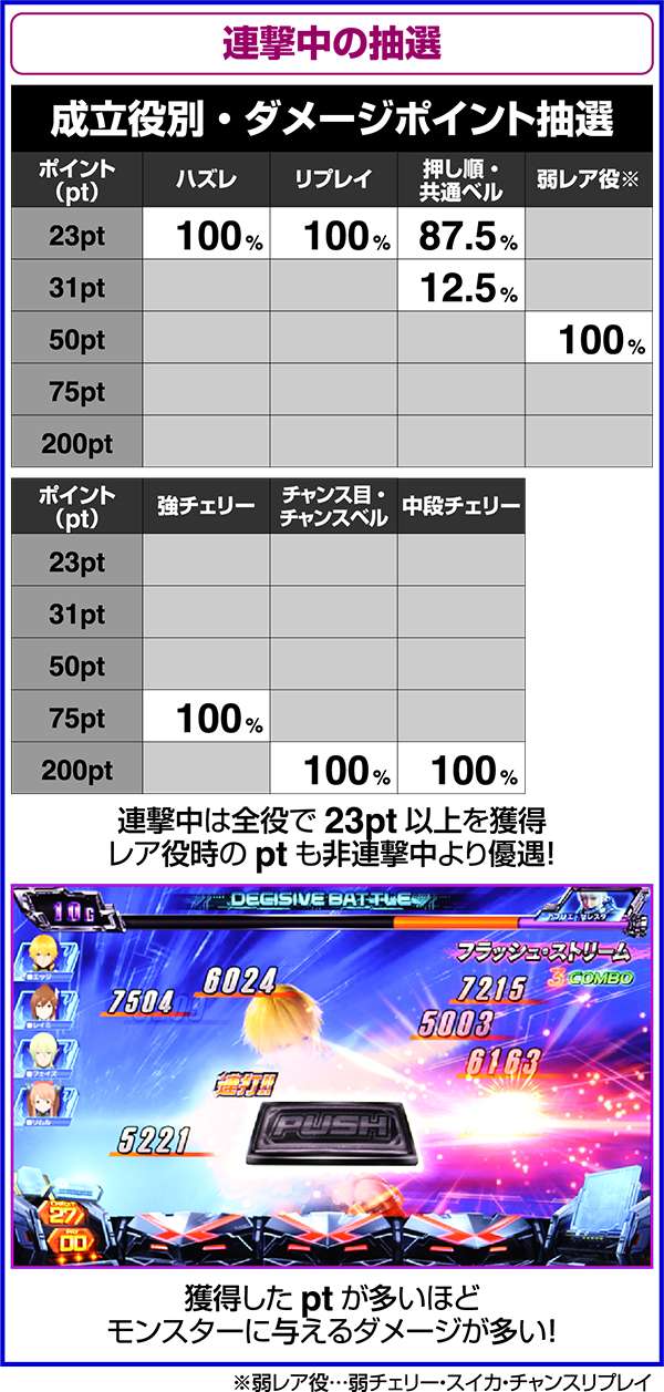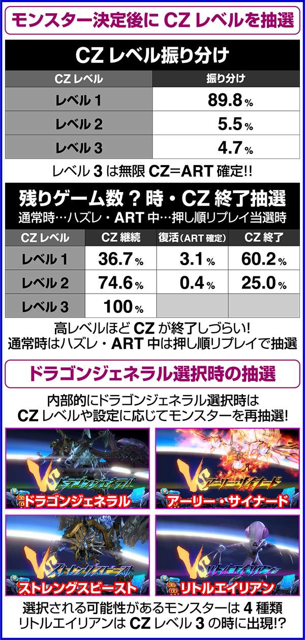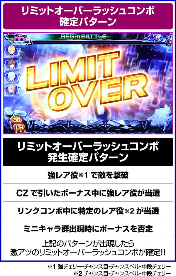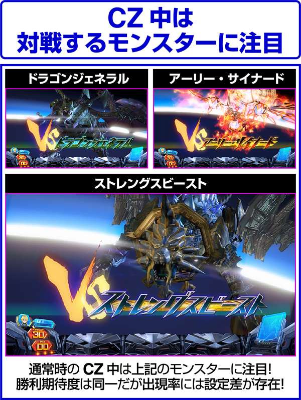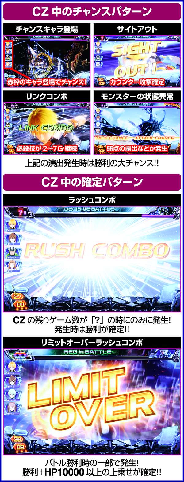 また、CZ中に引いたボーナス中に強チェリー・チャンス目・チャンスベルが成立した場合は200pt獲得が確定となる(200ptはモンスターの最大HP分のダメージをあたえるため、勝利確定)。つまり、HP大量上乗せのチャンスであるリミットオーバーラッシュコンボも確定ということになる。