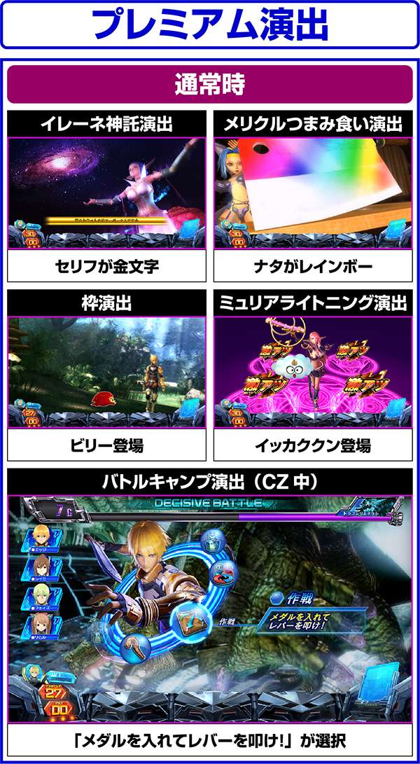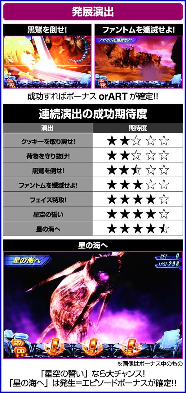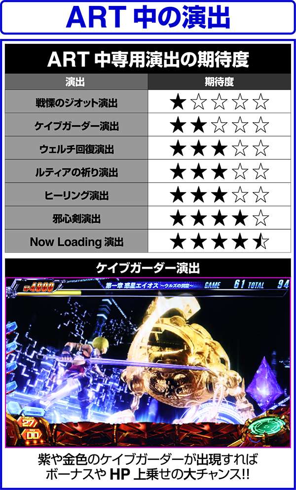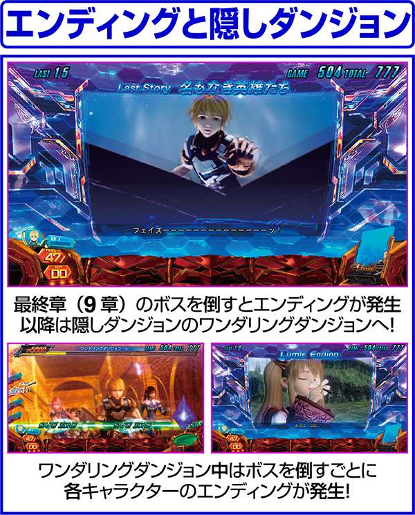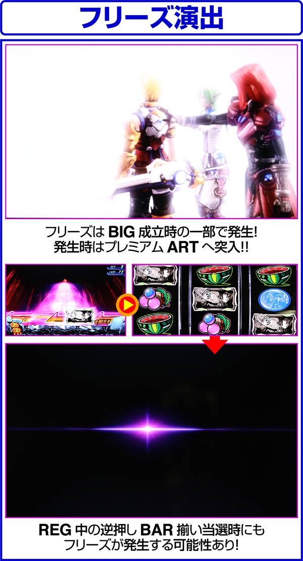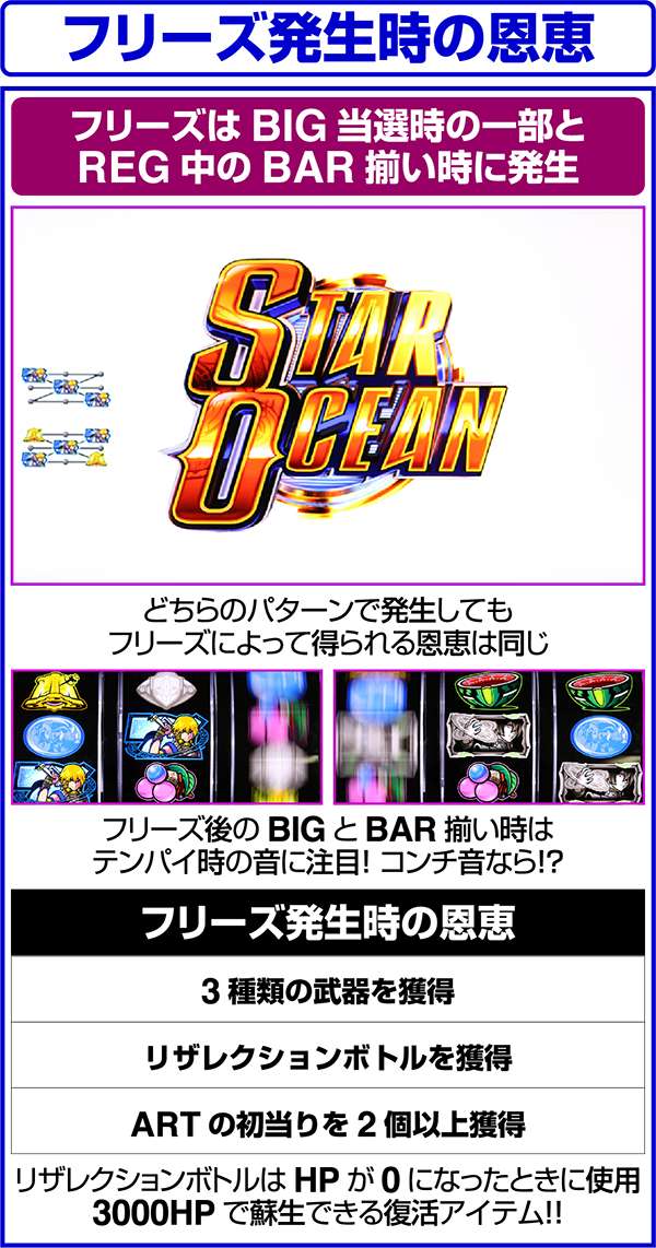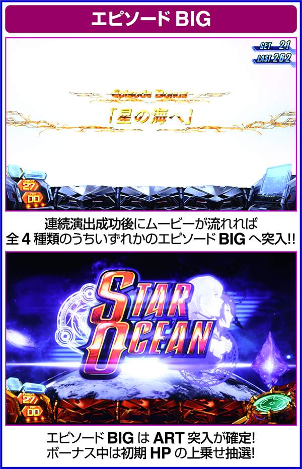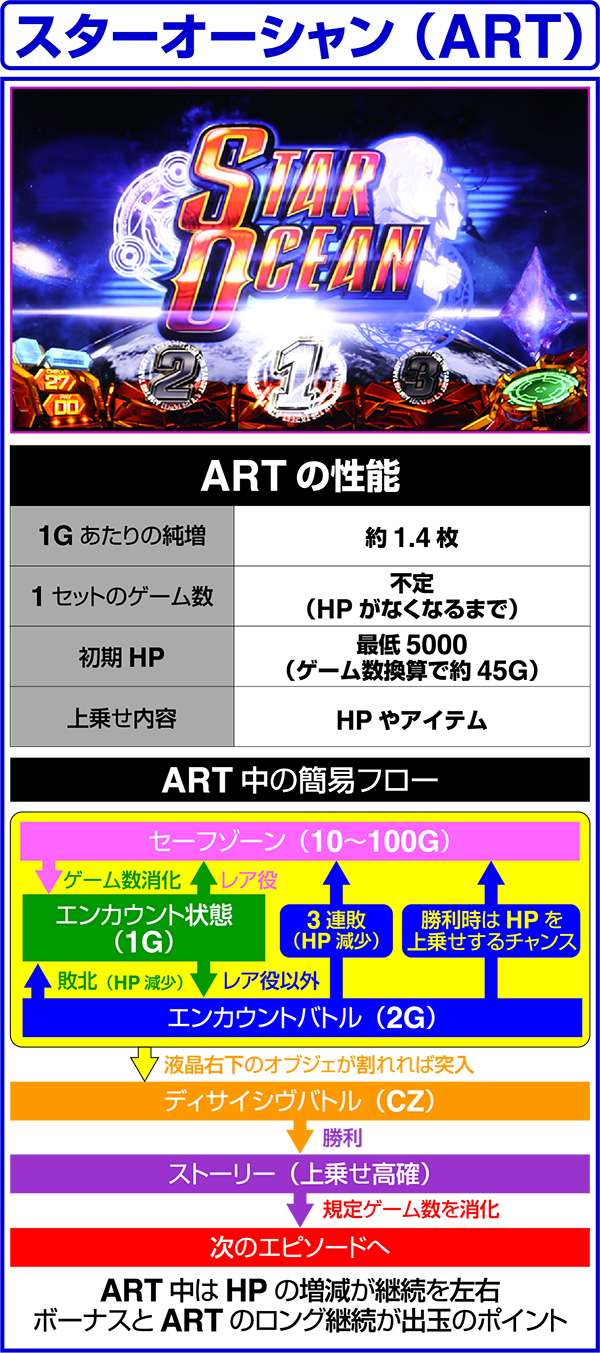 大人気ゲーム作品「スターオーシャン4」がボーナス+ARTタイプのパチスロとなって登場する。 出玉増加の軸となるのは1Gあたりの純増約1.4枚のART「スターオーシャン」。 ARTには規定ゲーム数はなく、HPによって管理されるという斬新なシステムとなっている。 また、ART突入のメイン契機は自力CZとなっており、通常時は周期によってCZの高確状態が抽選。内部状態は滞在ステージによって示唆される。 |