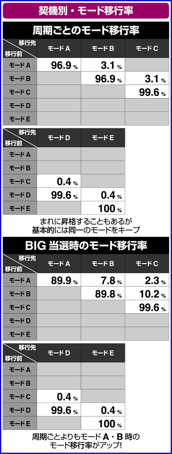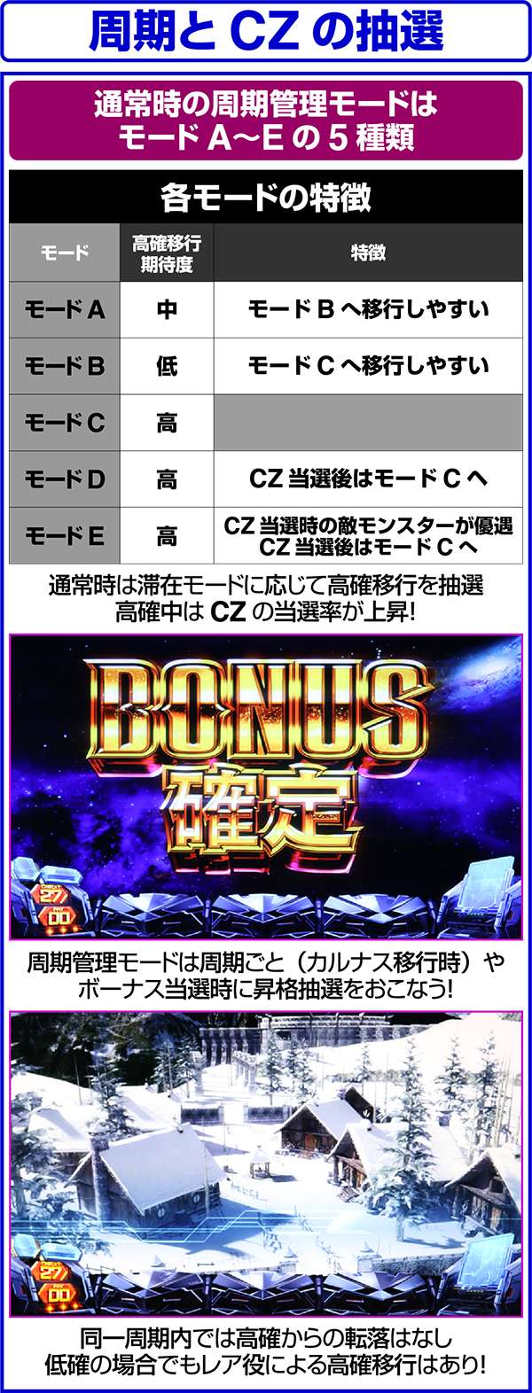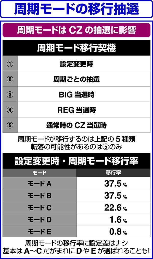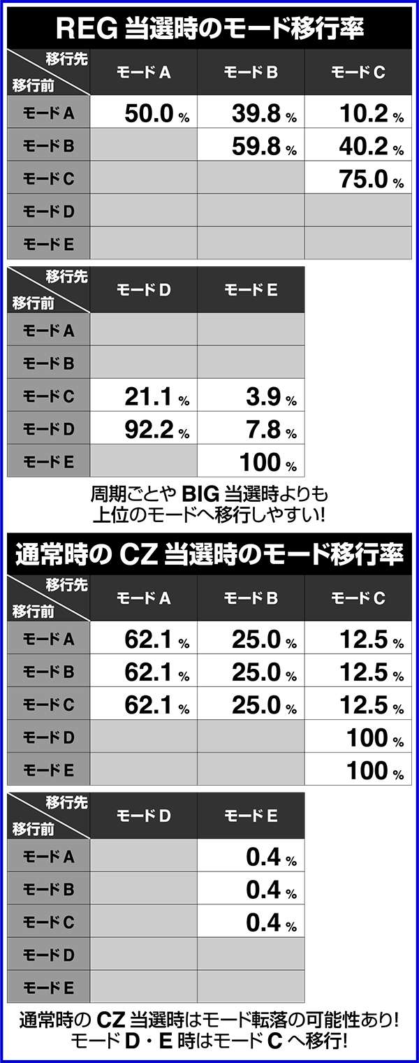 また、CZに当選するまでモードは転落しないため、モードC以上に昇格したら高確周期が終わっても継続して高確周期となる可能性が高い。