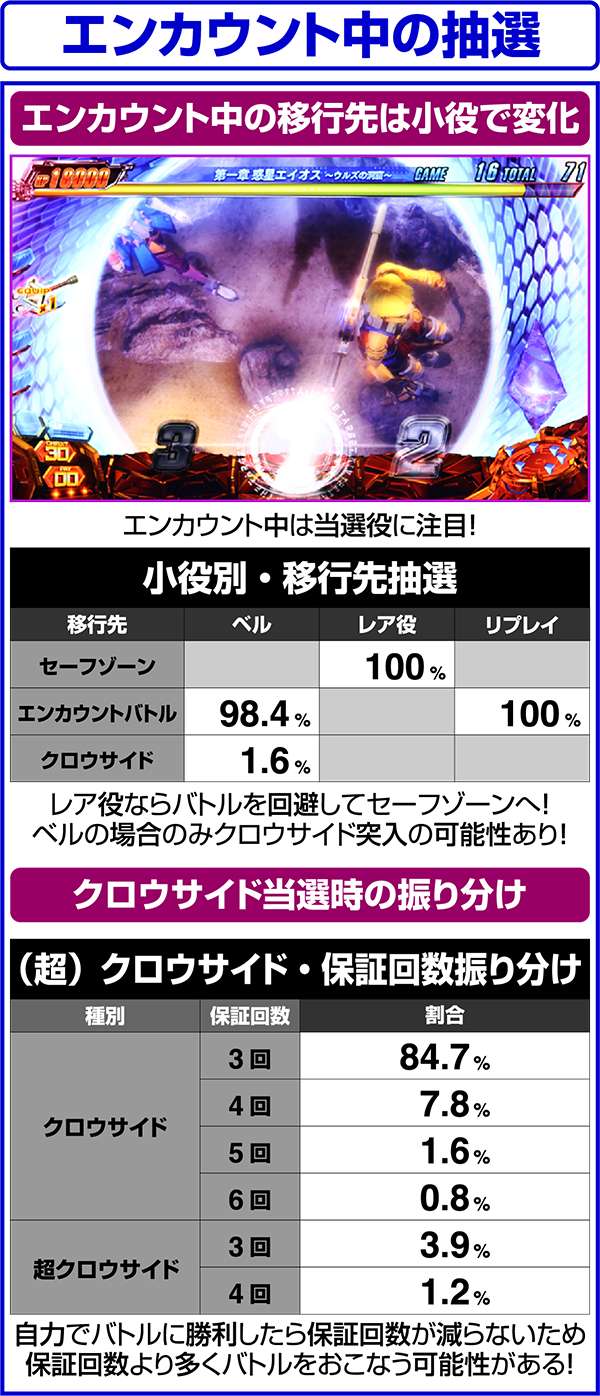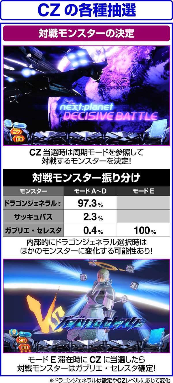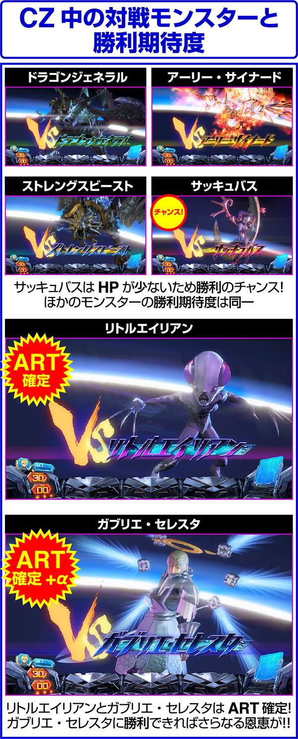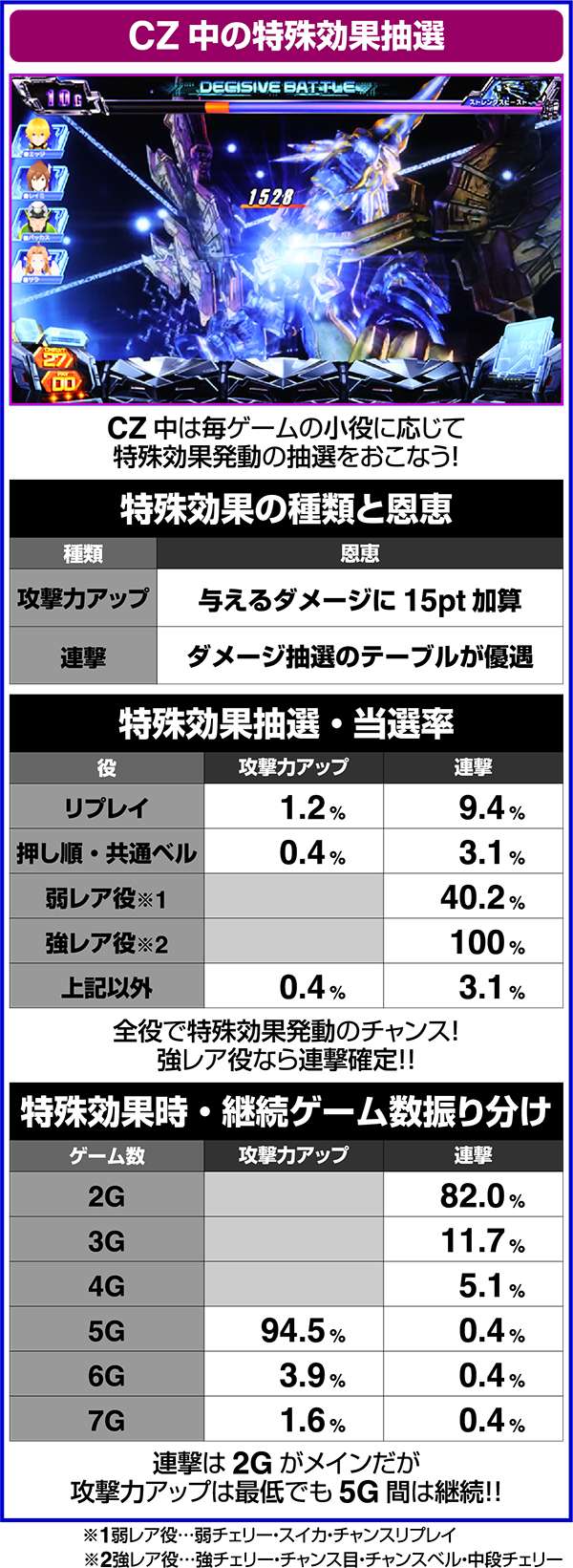 CZ中は毎ゲームの成立役に応じて、ダメージと特殊効果の抽選をおこなっている。当選時はバトルに有利な効果が発揮されるため、勝利の大チャンス。