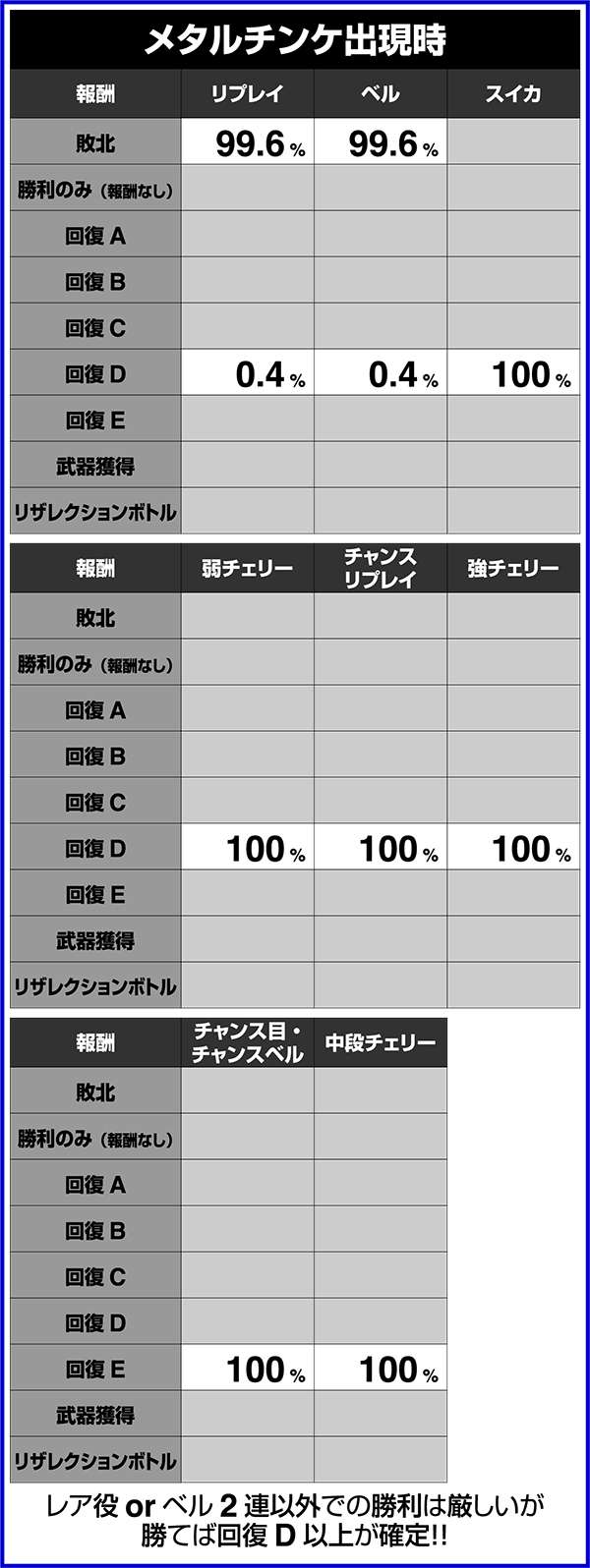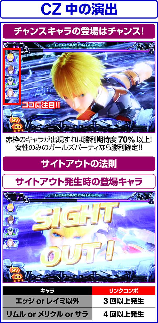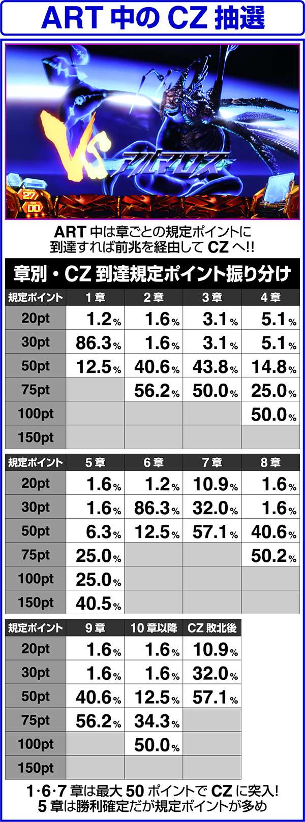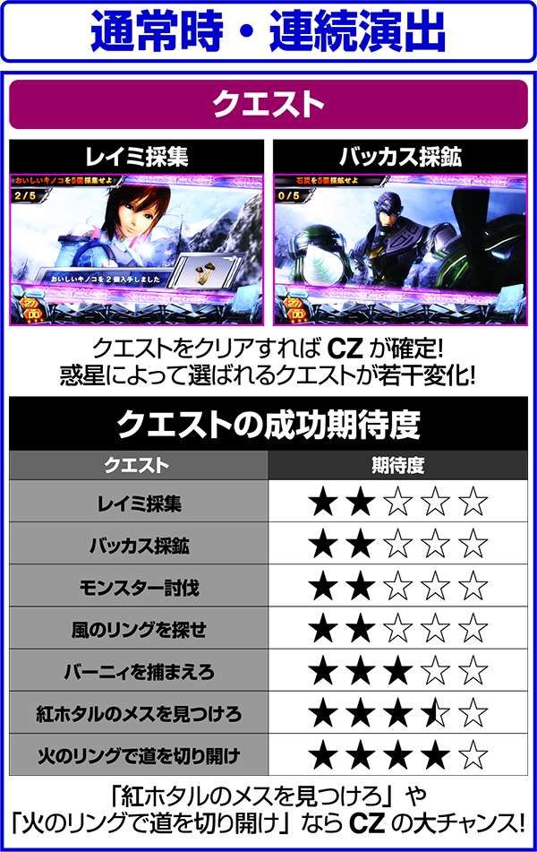 CZ中は毎ゲームの成立役に応じて、ダメージと特殊効果の抽選をおこなっている。当選時はバトルに有利な効果が発揮されるため、勝利の大チャンス。
