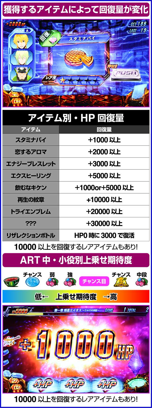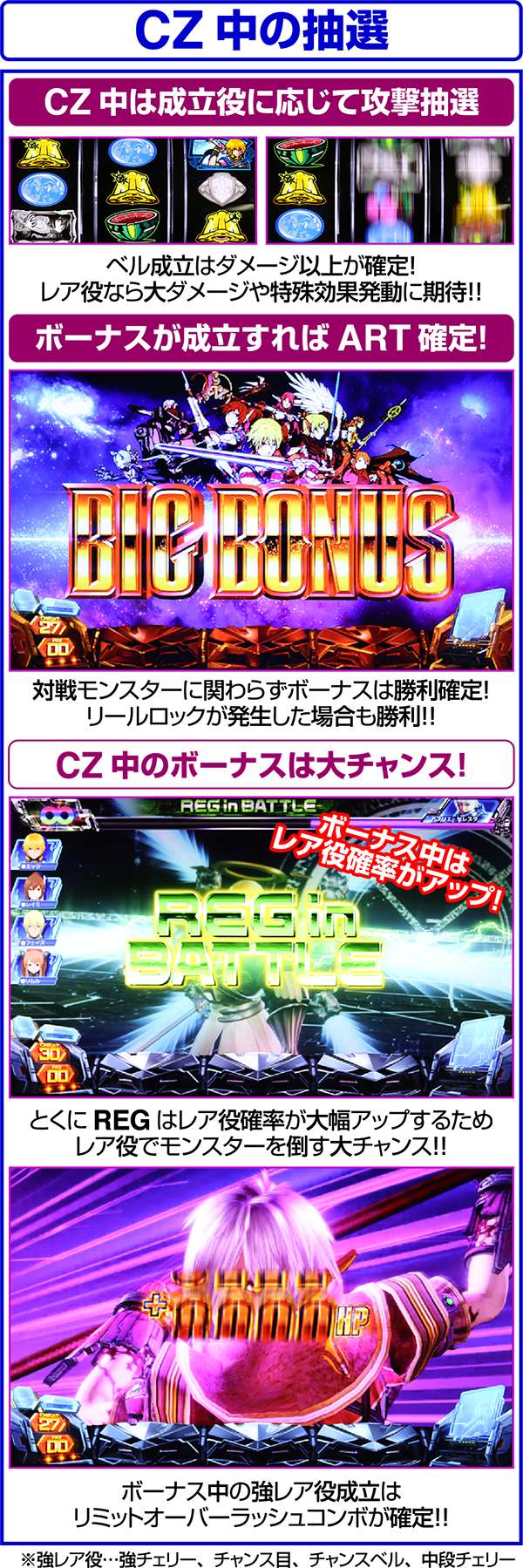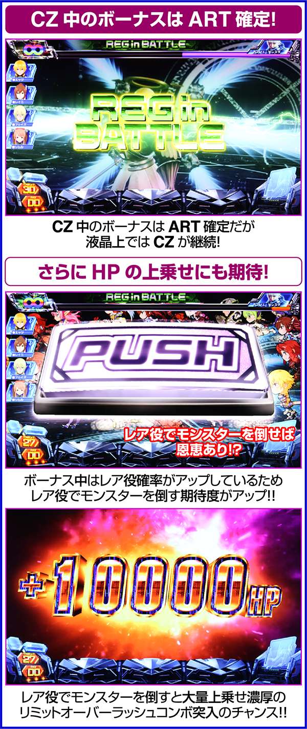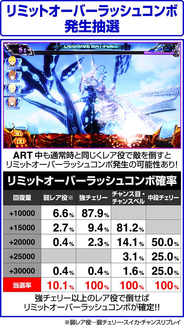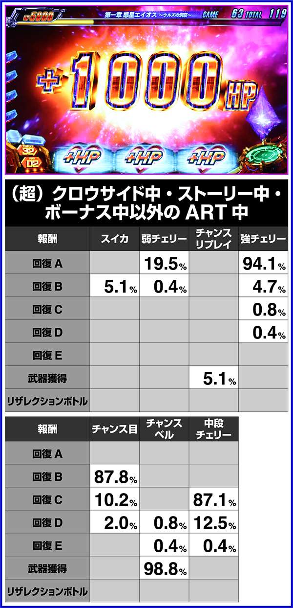 ART中のCZでは、強チェリー・チャンス目・チャンスベル・中段チェリーで倒せばリミットオーバーラッシュコンボが確定し、10000以上のHPを回復する。