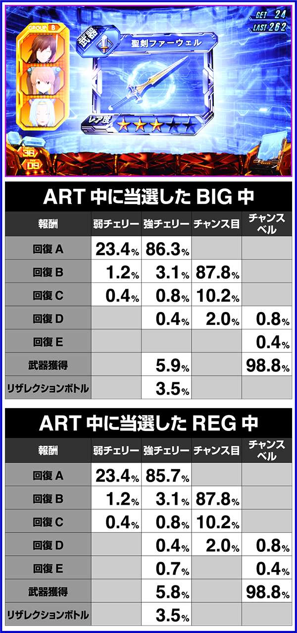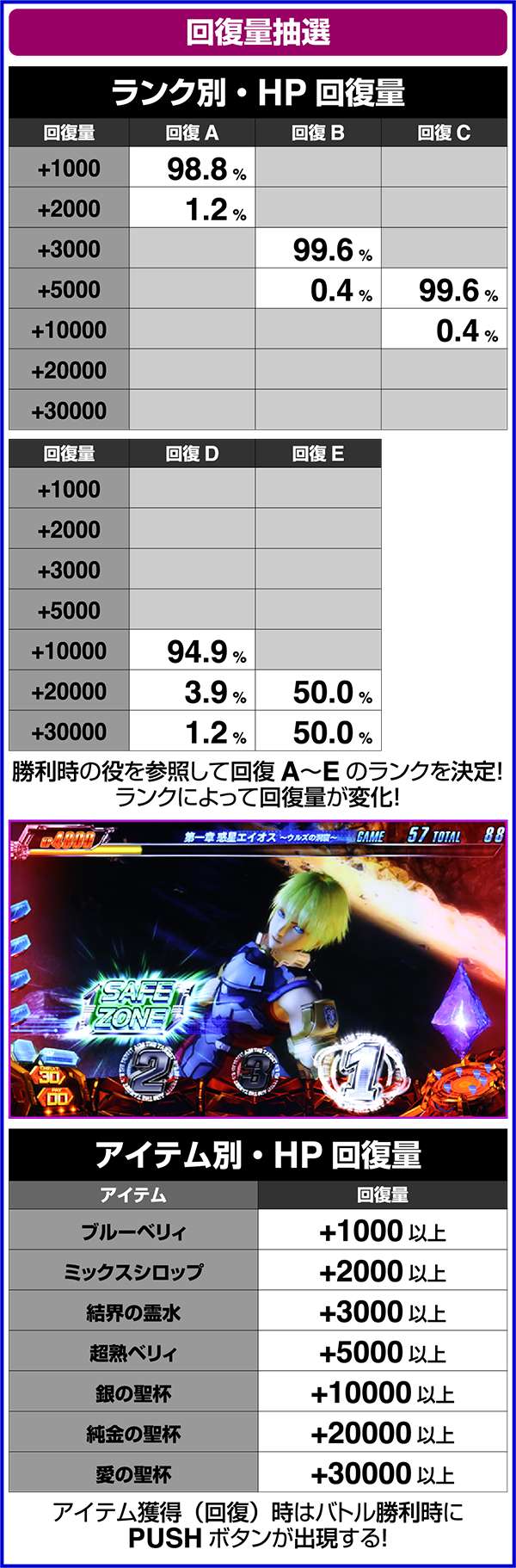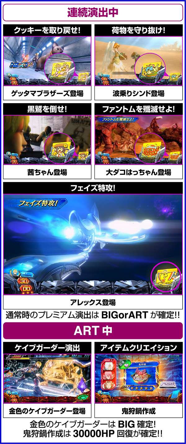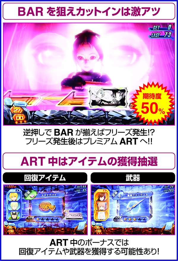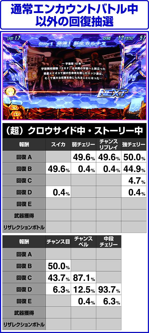 ART中のCZでは、強チェリー・チャンス目・チャンスベル・中段チェリーで倒せばリミットオーバーラッシュコンボが確定し、10000以上のHPを回復する。