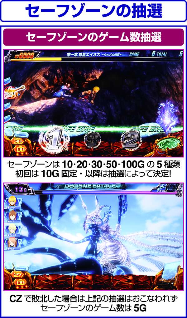 ちなみに、CZに敗北した後やボーナス終了後のセーフゾーンは一律で5Gとなる(セーフゾーン中にボーナスを引いた場合は+5G)。