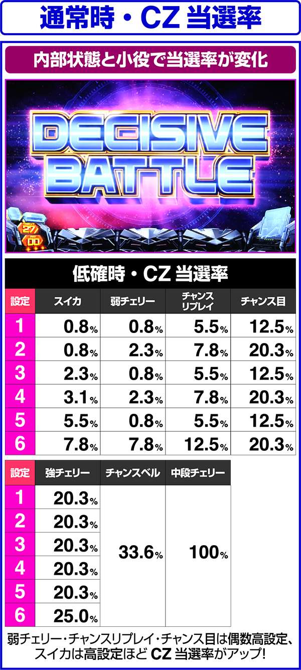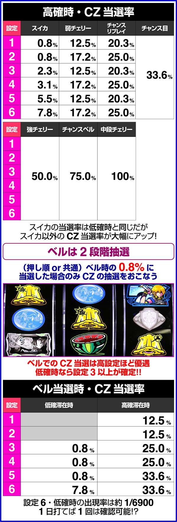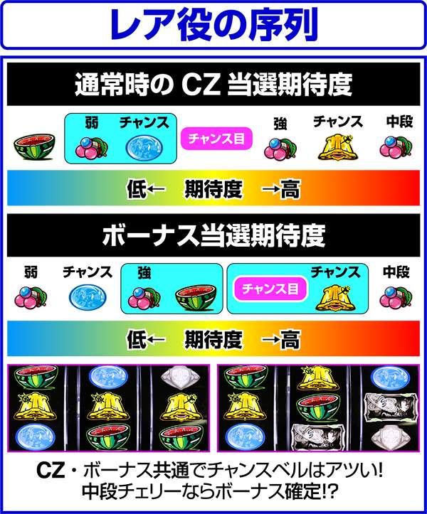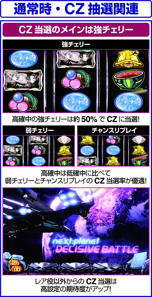 ただし、周期が低確の場合でもレア役などで高確へ移行する場合があり、どちらかが高確なら高確扱いでCZを抽選している。