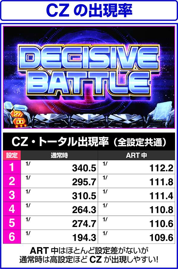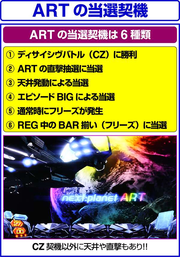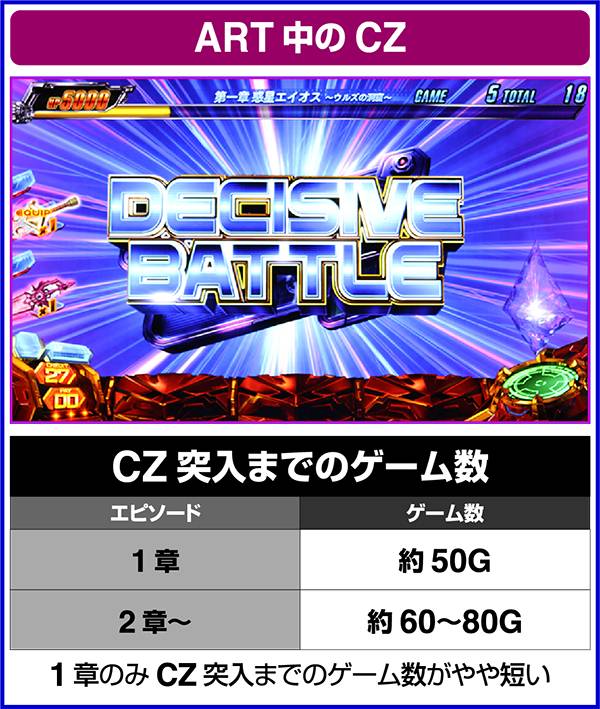 ARTの当選契機は全部で6種類あり、メインとなるのはディサイシヴバトル(CZ)。
