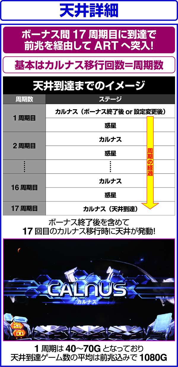 つまり、CZやART本前兆中のカルナス移行は次の周期に入ったという扱いにはならないため、注意しよう。