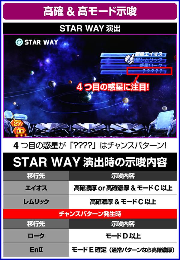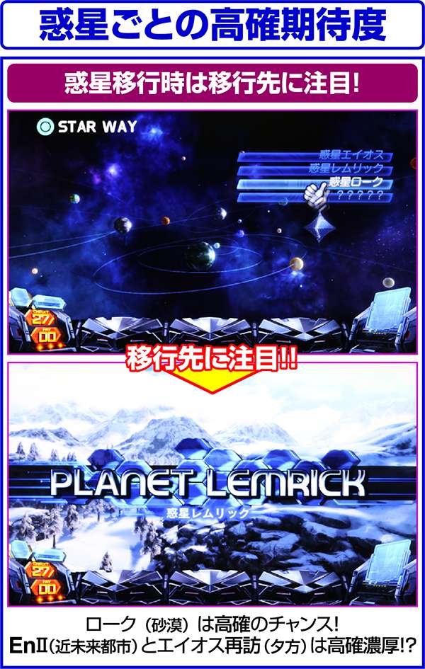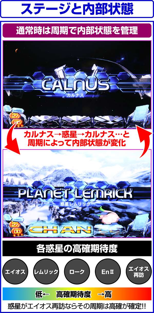 1周期が終わるまで周期による内部状態の転落はないため、高確濃厚の惑星に移行した時は最低でも周期終了まで、高確に移行した=高モードの可能性もあるため、可能であれば次の周期の惑星を確認するまでは遊技を続けるようにしたい。