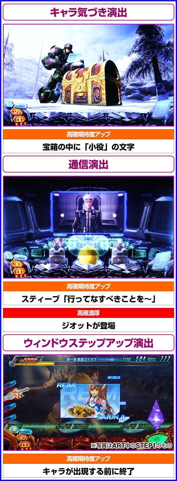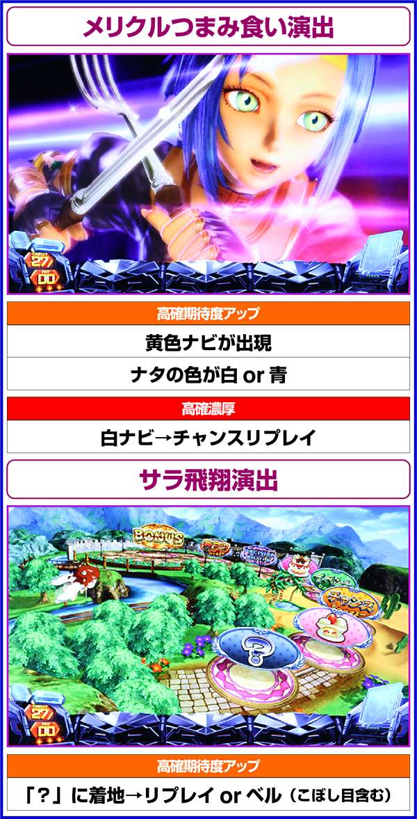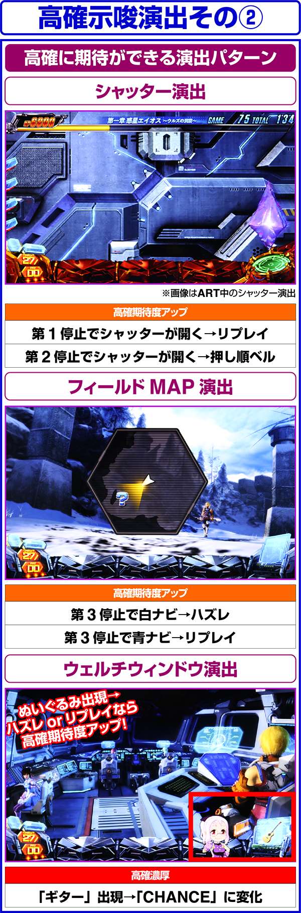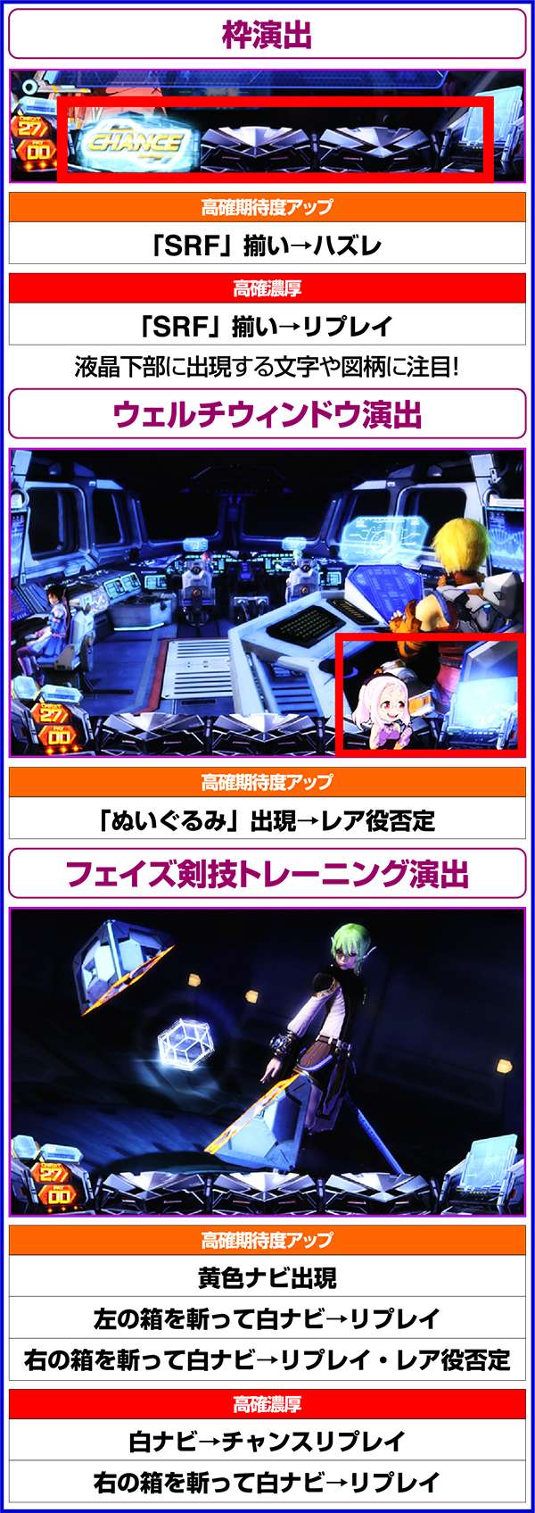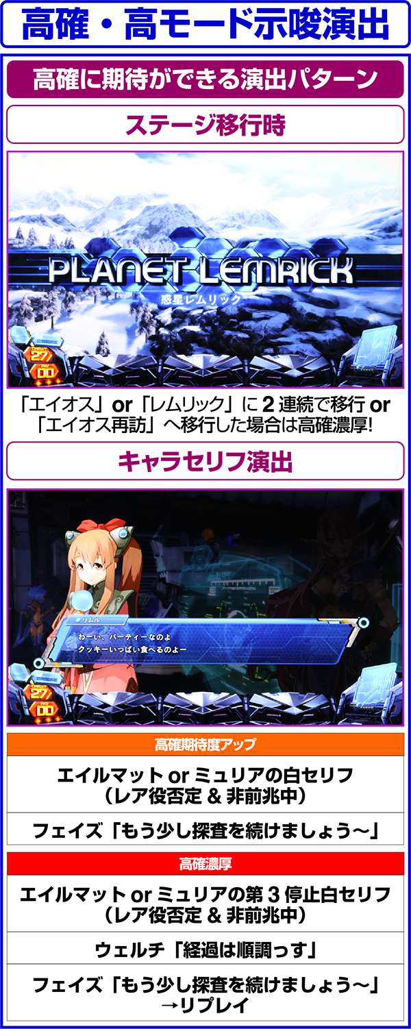 周期モードによる高確は同一周期内で転落することがないため、高確濃厚の演出を確認した場合は最低でも周期終了までは打つようにしたい(レア役を引いていた場合はレア役で移行した可能性もあり)。