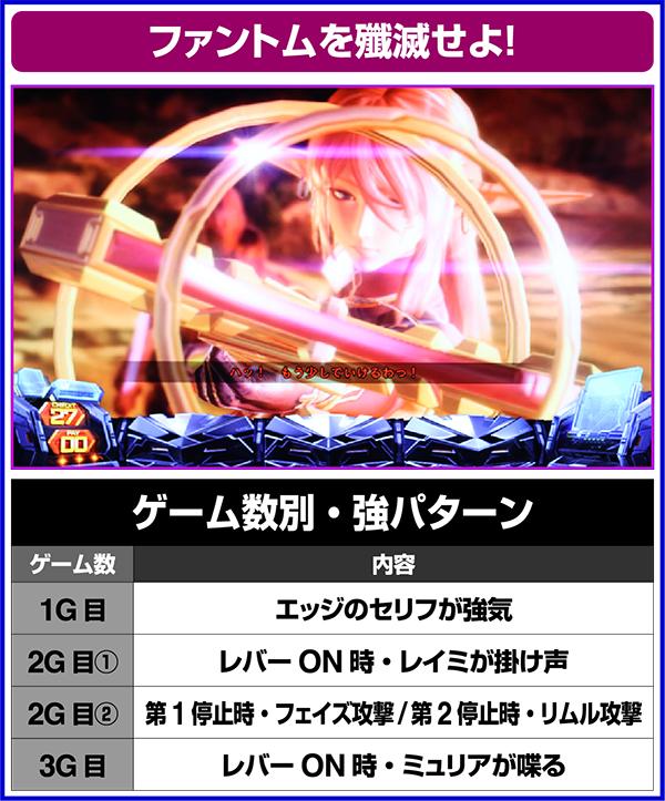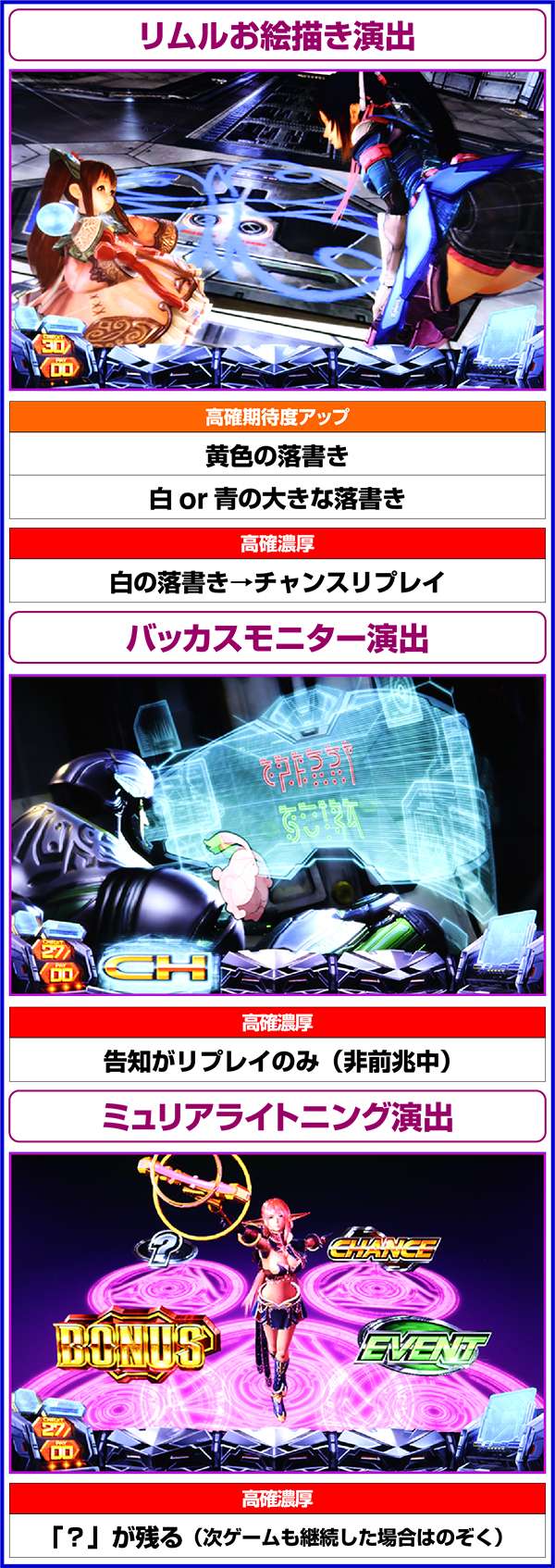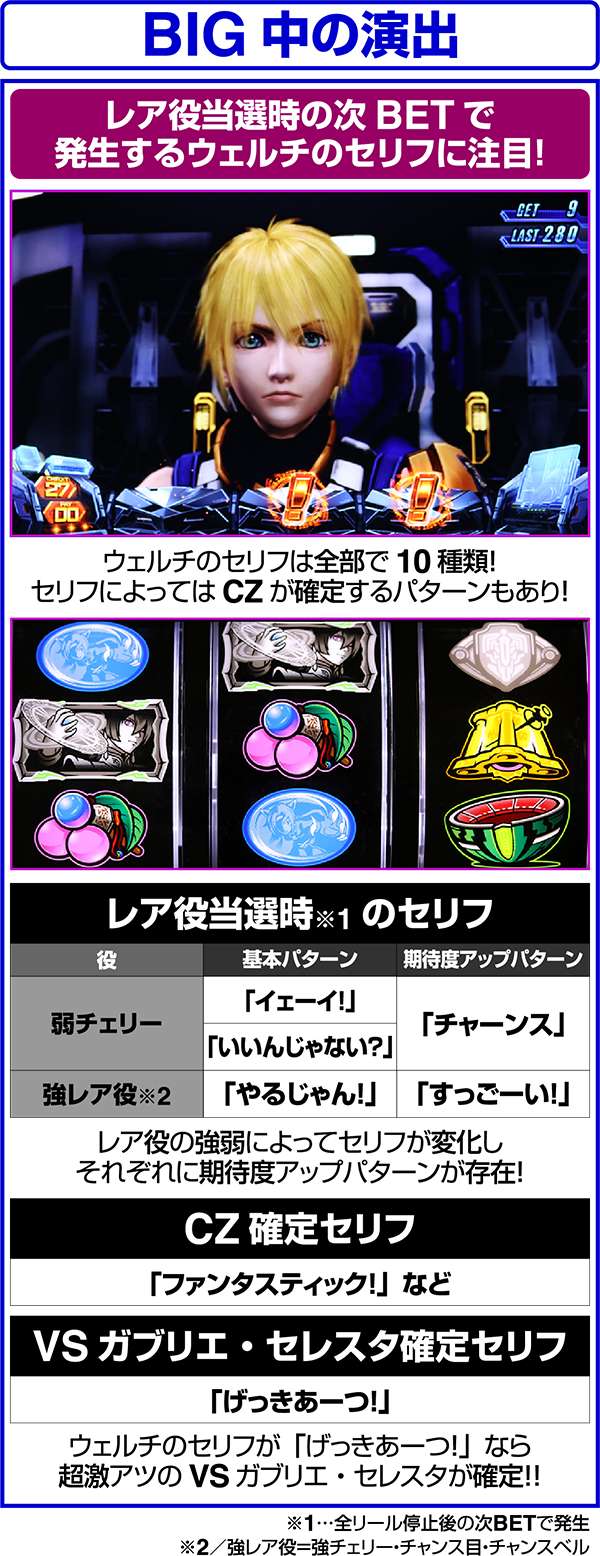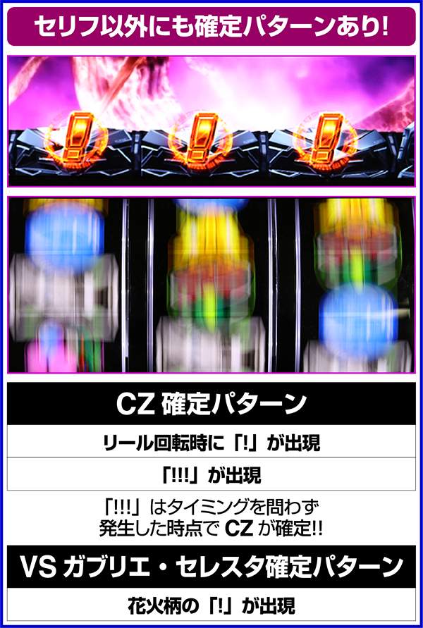 レア役を示唆する「!」出現は、レバーON時ではなく、リール回転時に出現すればCZ確定。「!!!」はCZ 確定、花火柄の「!」はVSガブリエ・セレスタが確定。