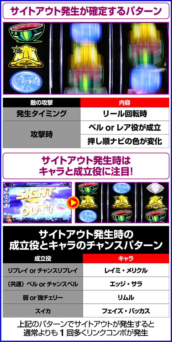 通常はベル以外の時にエッジ・リプレイ以外の時にレイミなどの組み合わせでサイトアウトが発生する。