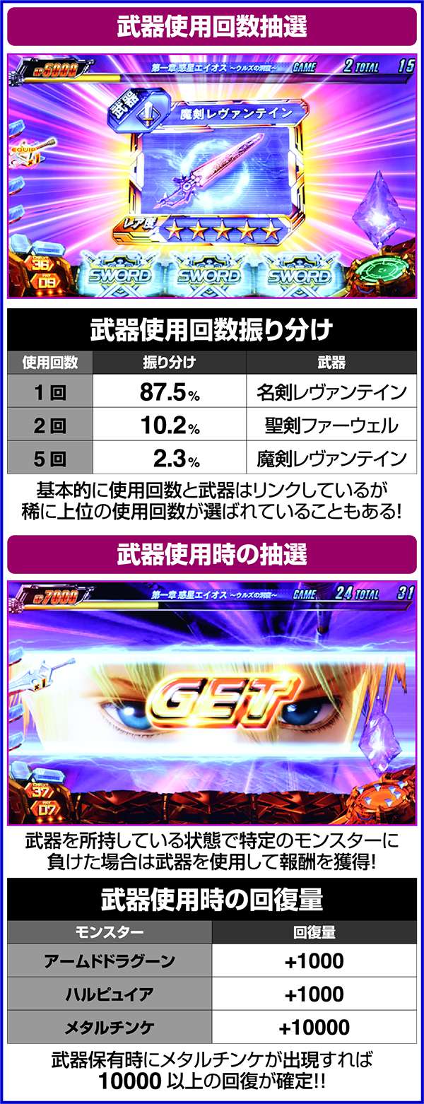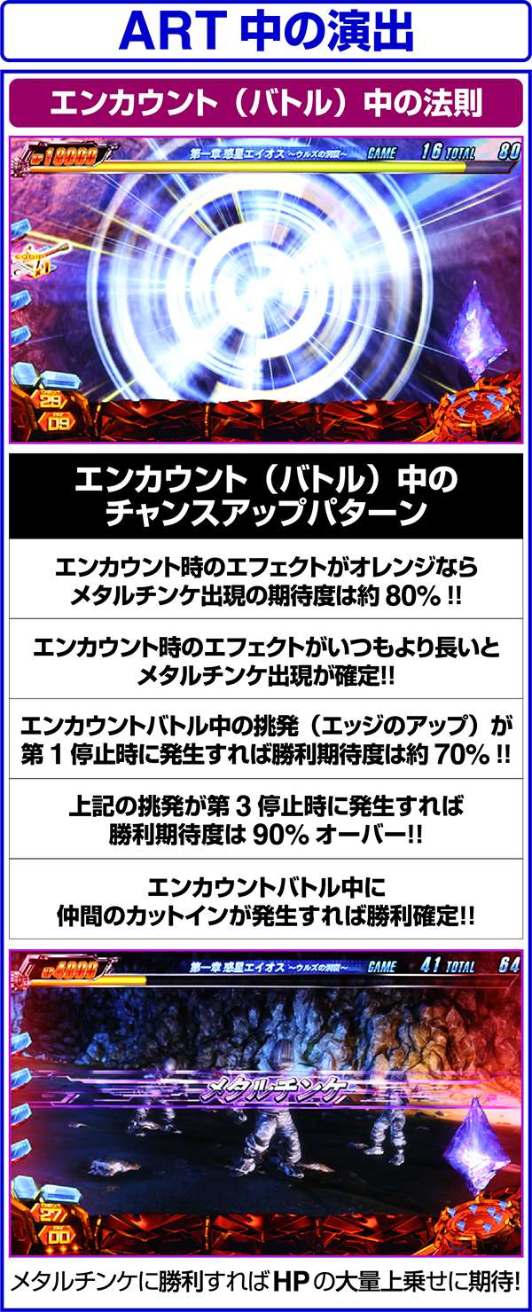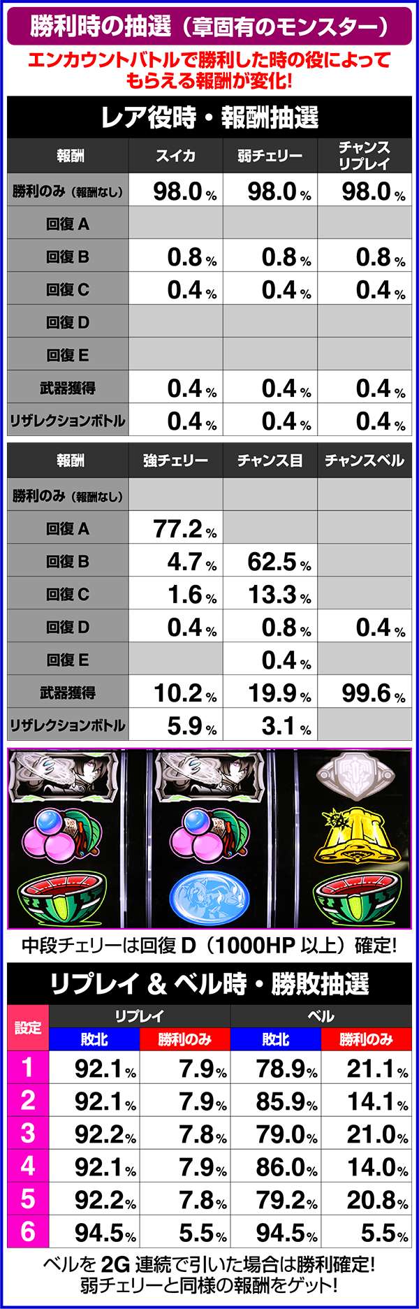 エンカウントバトル中はレア役を引ければ勝利確定。2G連続でベルが成立した場合も勝利確定となり、勝利時はHPを上乗せするチャンス。敗北の場合でも武器アイテムを持っていれば勝利に書き換えてくれる。