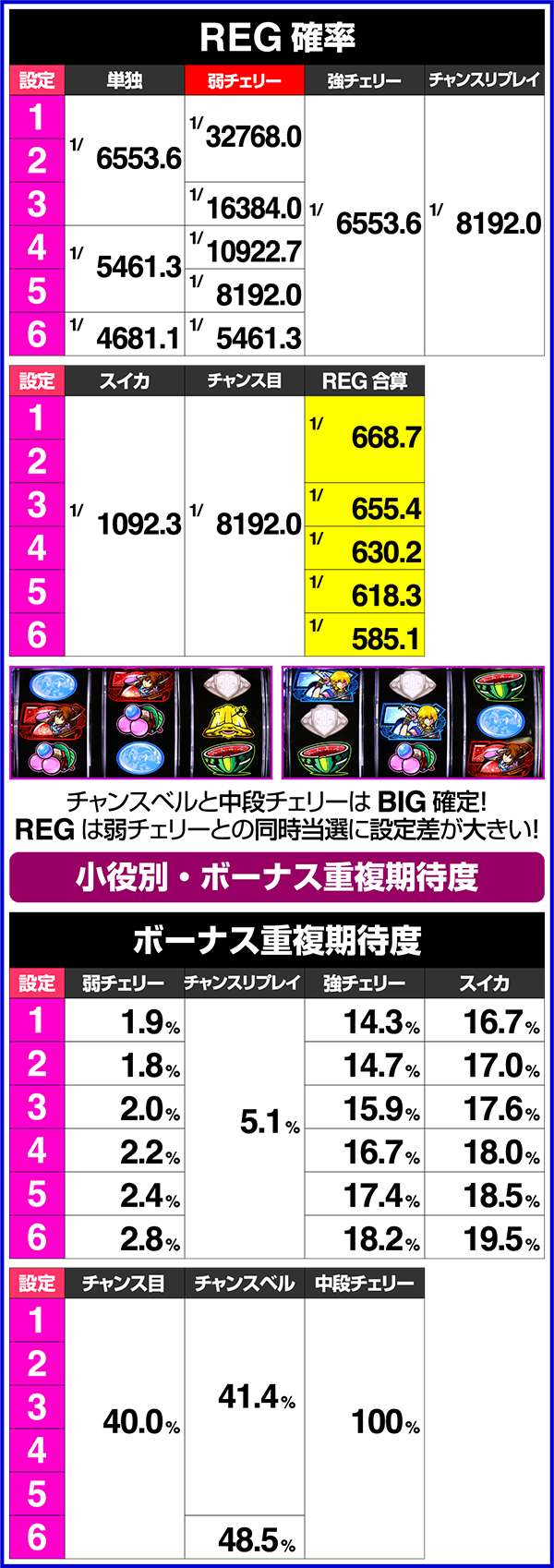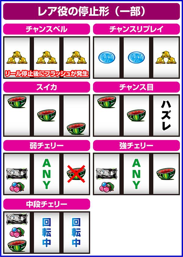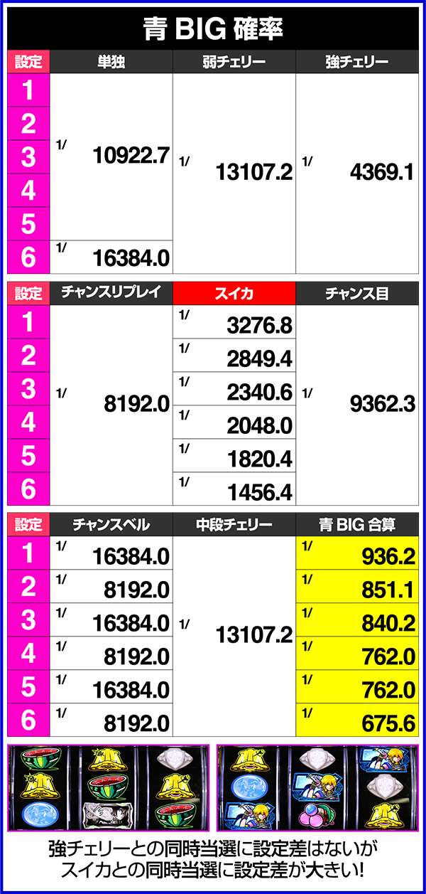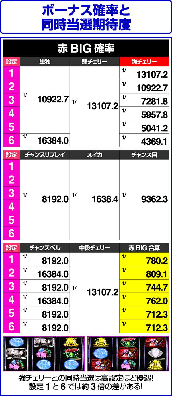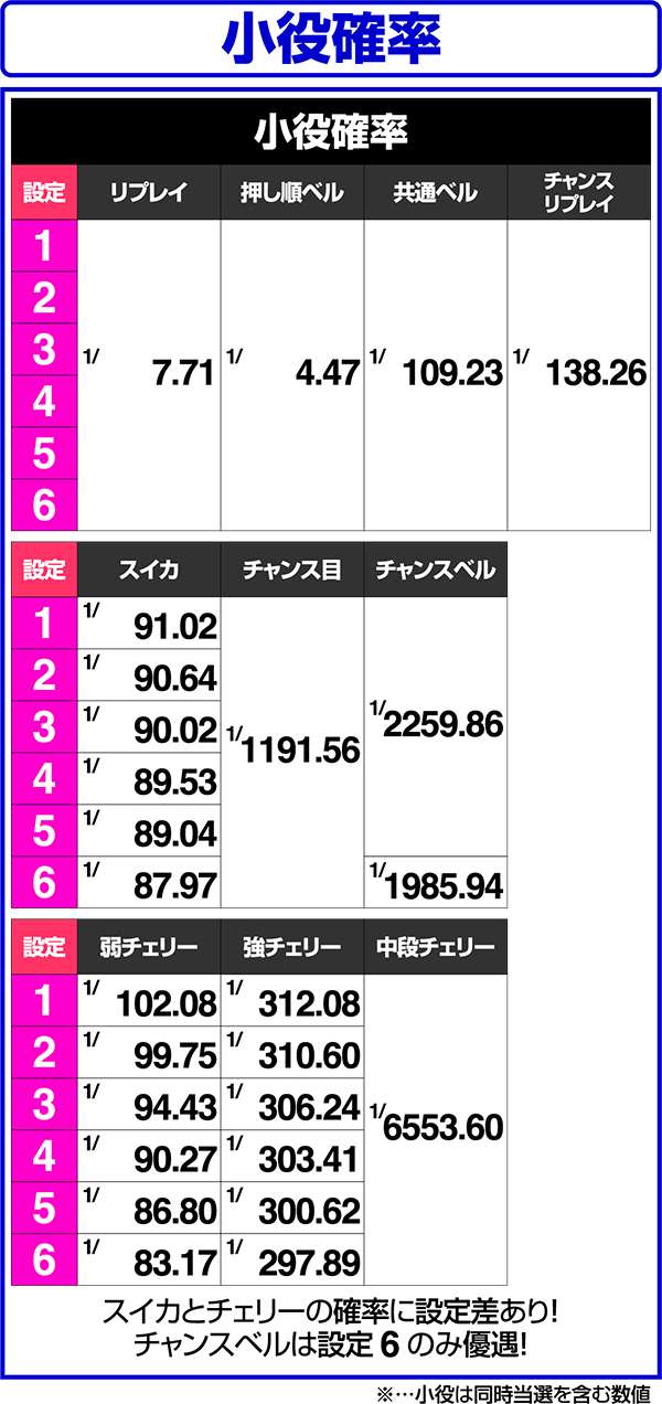 小役確率はスイカとチェリーに設定差があり、とくに弱チェリーは設定差が大きい。