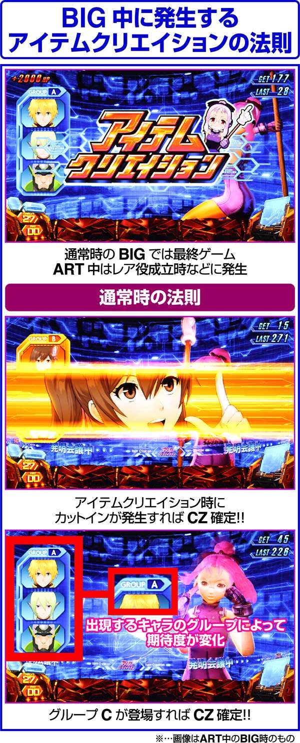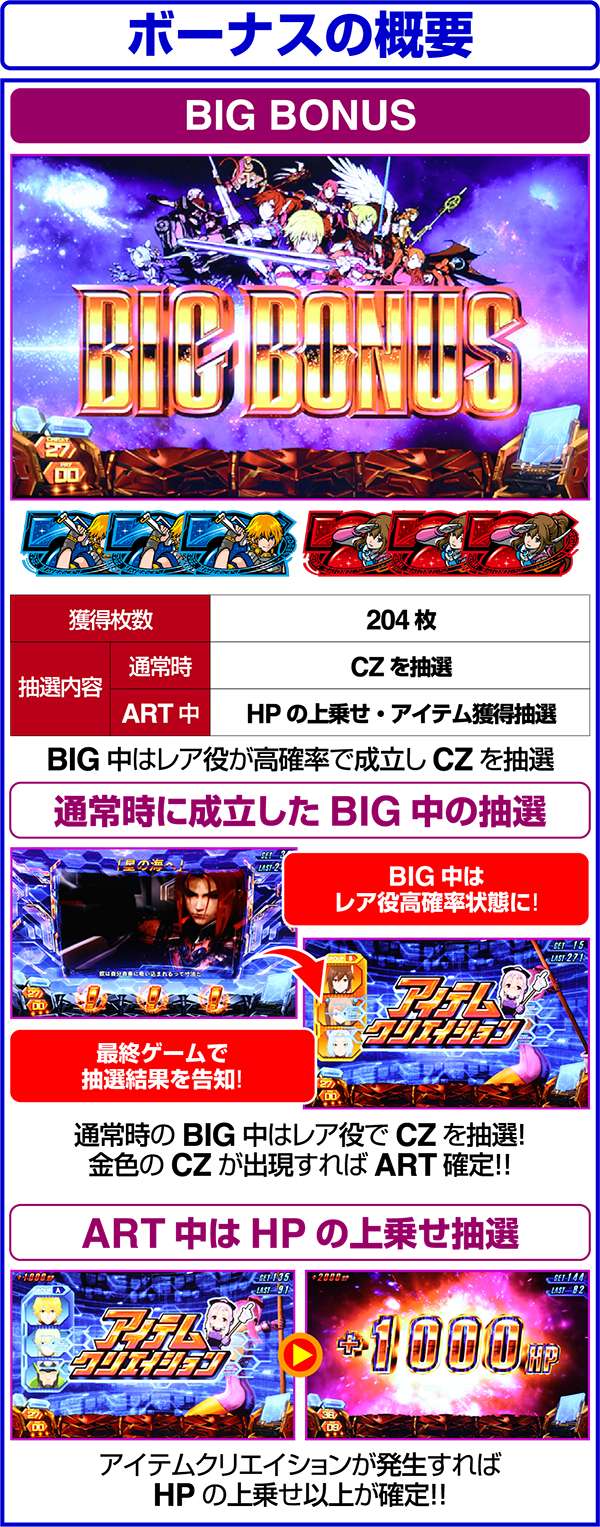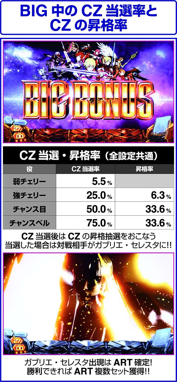 通常時にCZを獲得し、前兆中にBIGに当選した場合は獲得しているCZの昇格抽選をおこなうというわけでなく、BIG中もCZを抽選。当選したらBIG中に獲得したCZの昇格抽選をおこなう。