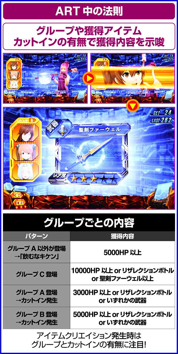 また、エンカウントバトルの負けを勝ちに書き換えたりHPが0になっても蘇生できるなど、アイテム獲得時はARTの継続に期待が持てる。