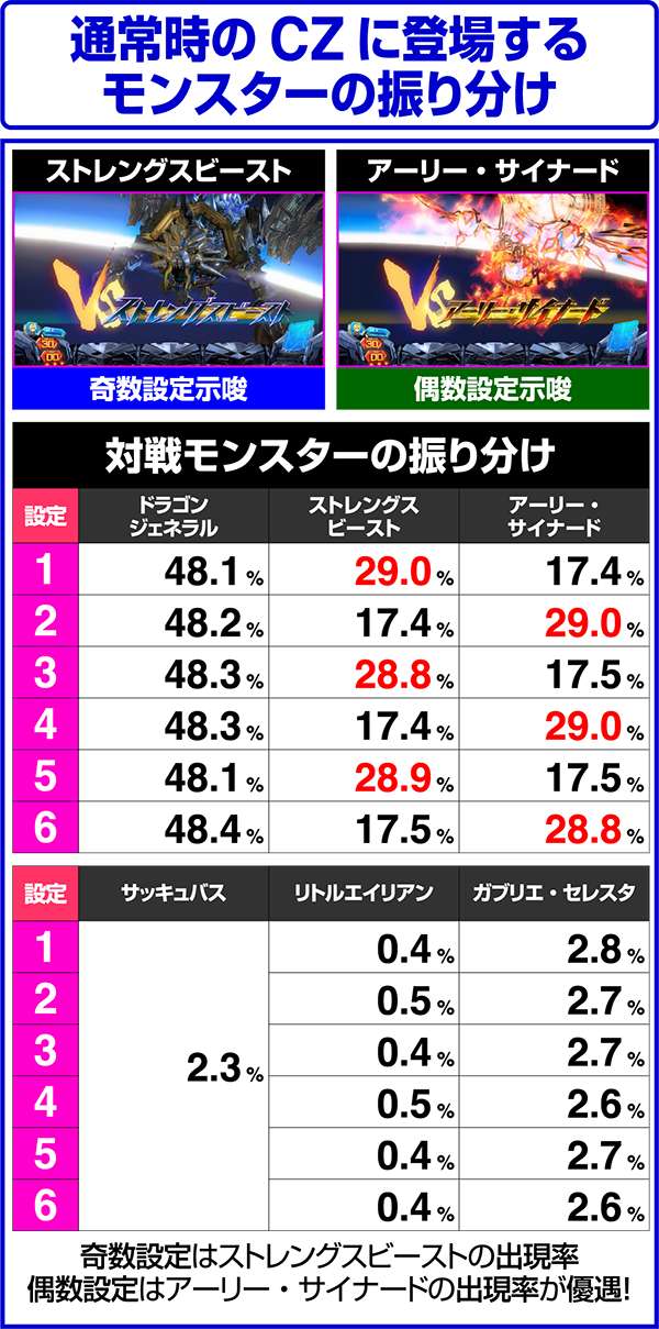 CZ中のわかりやすい設定差はストレングスビーストとアーリー・サイナードの出現率のみとなっている。