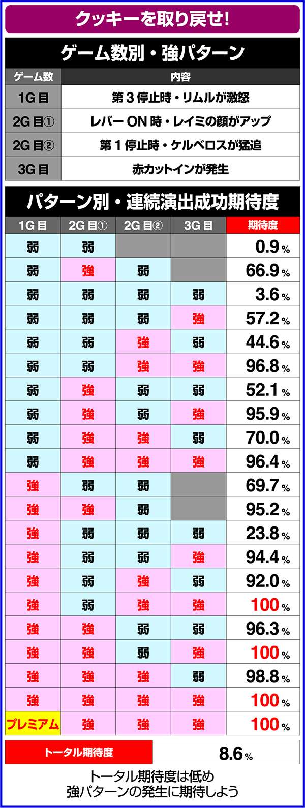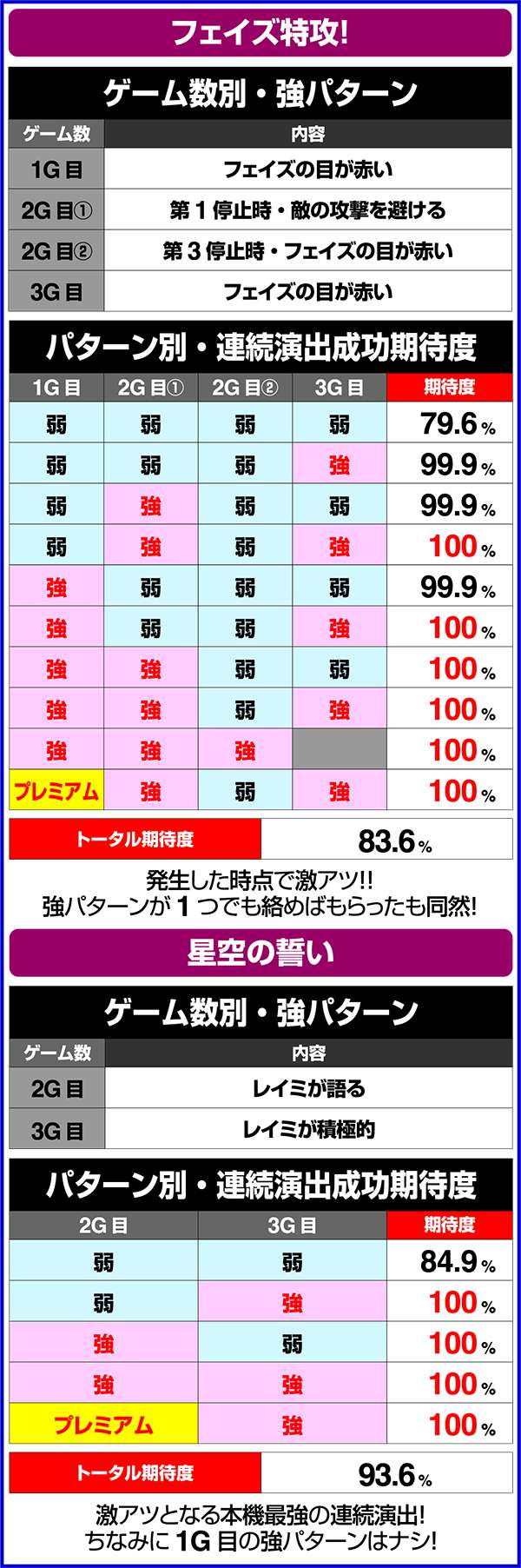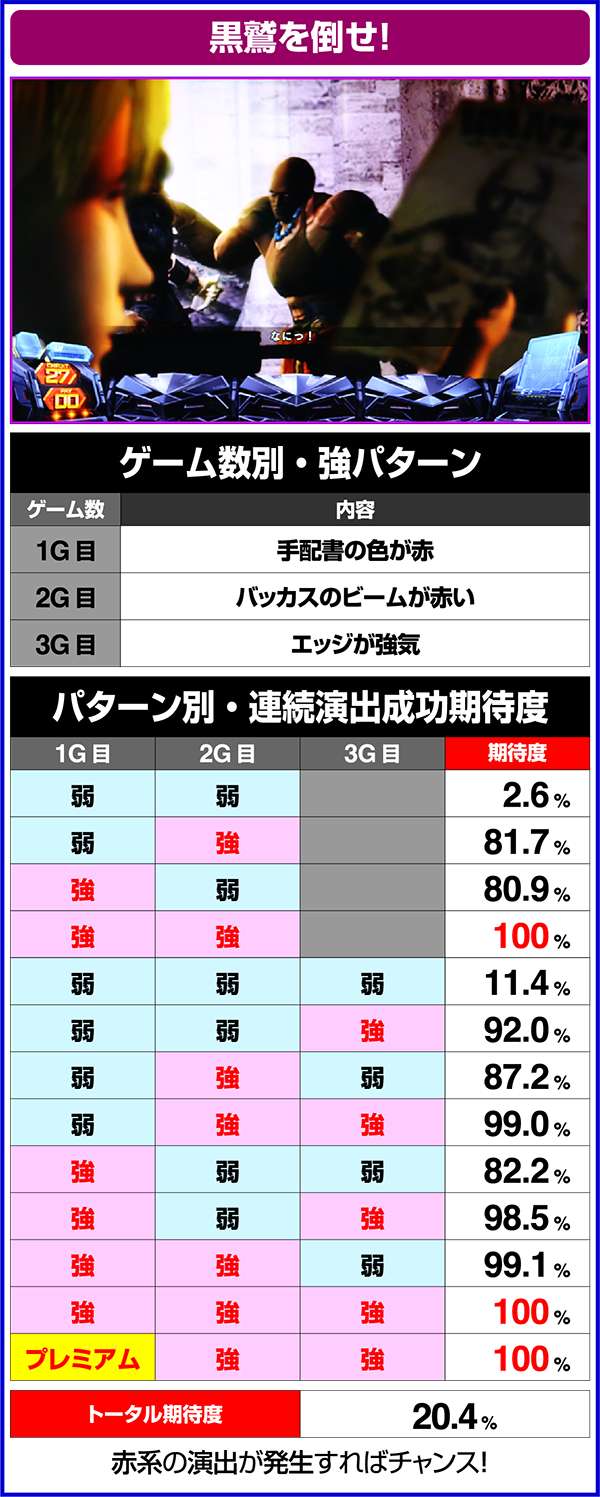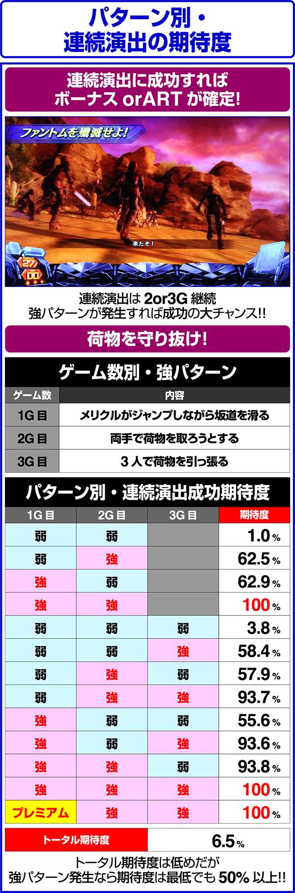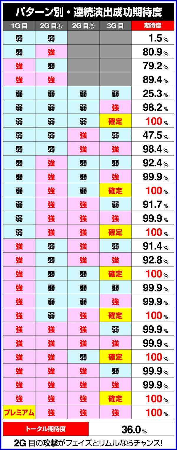 トータル期待度が低めの演出でも強パターンが発生すれば激アツとなるなど、連続演出の成功には強パターンの有無が重要。