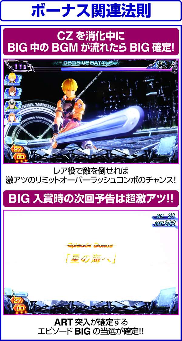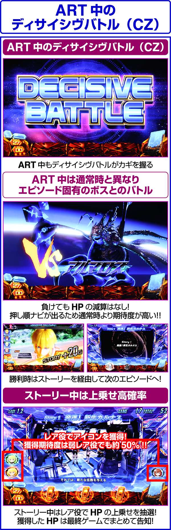 ART中のディサイシヴバトル(CZ)は次のエピソードへ進む契機となっているため、通常時だけでなくART中も重要。すべてのボスを撃破し、エピソードの制覇を目指そう。