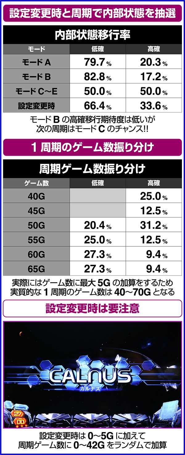 設定変更時のみ、1周期のゲーム数に0〜42Gがランダムで加算されるため、朝イチ1周期目のゲーム数は最大で112Gとなる。
