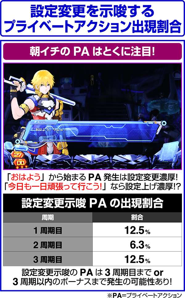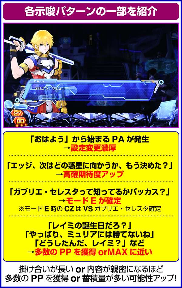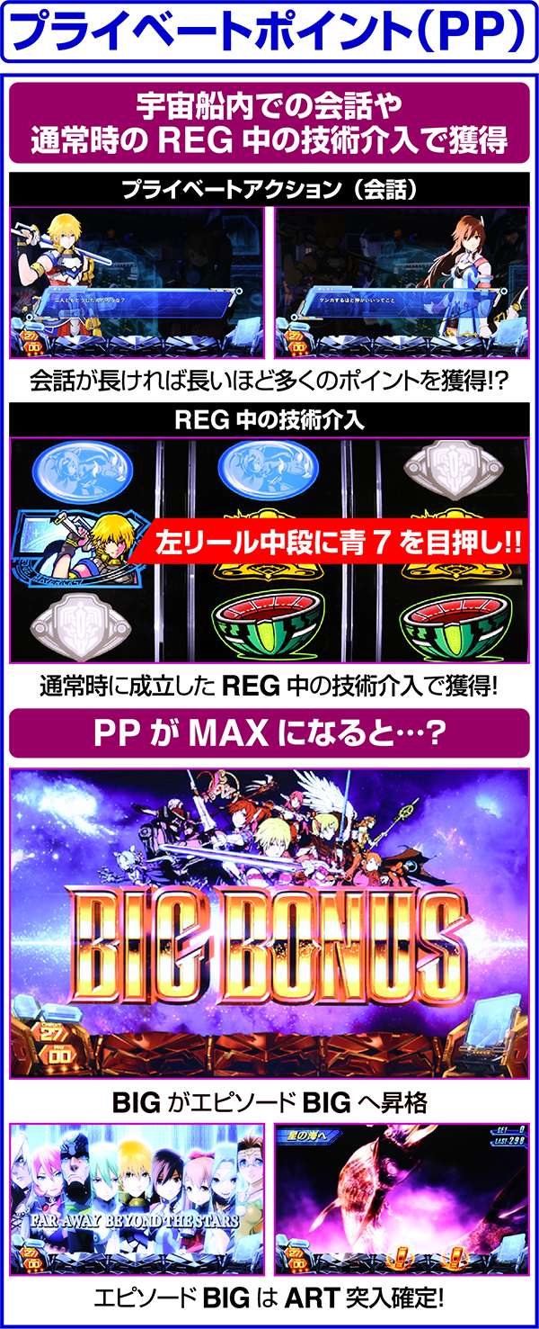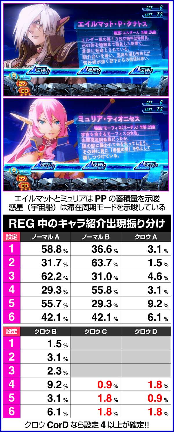 獲得しているプライベートポイントは、REG中のキャラ紹介にエイルマットやミュリアが登場するなど、複数の箇所で示唆をしている。