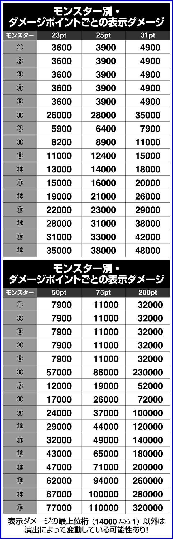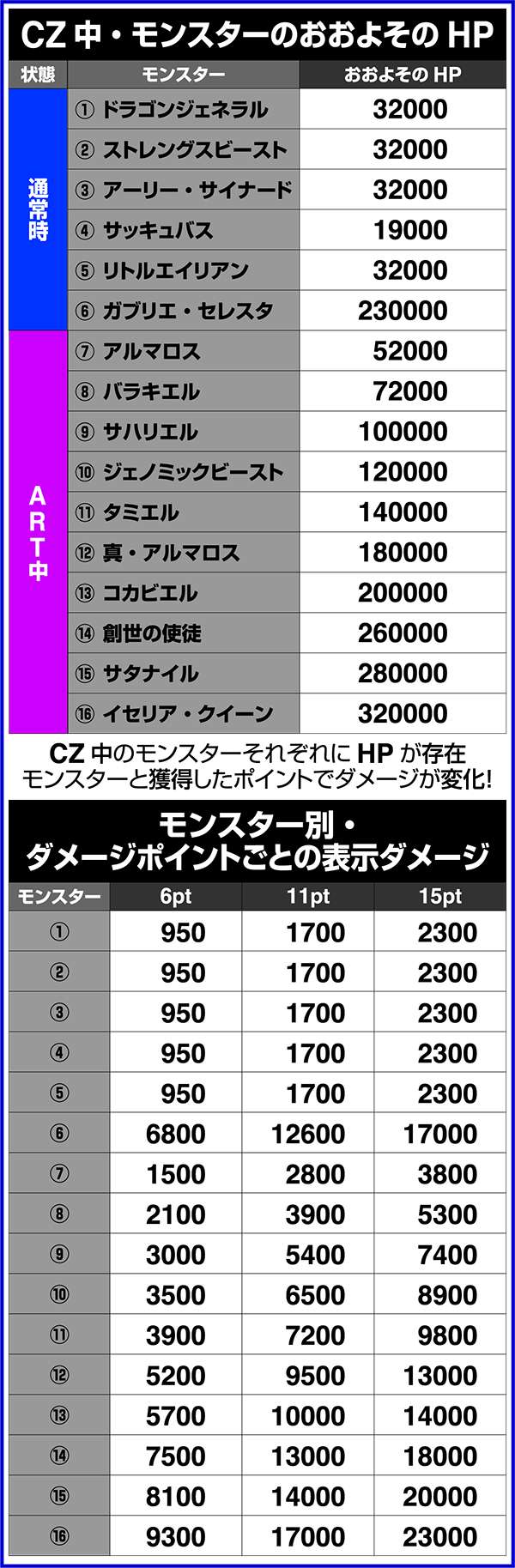CZレベルと対戦モンスターごとのダメージ抽選