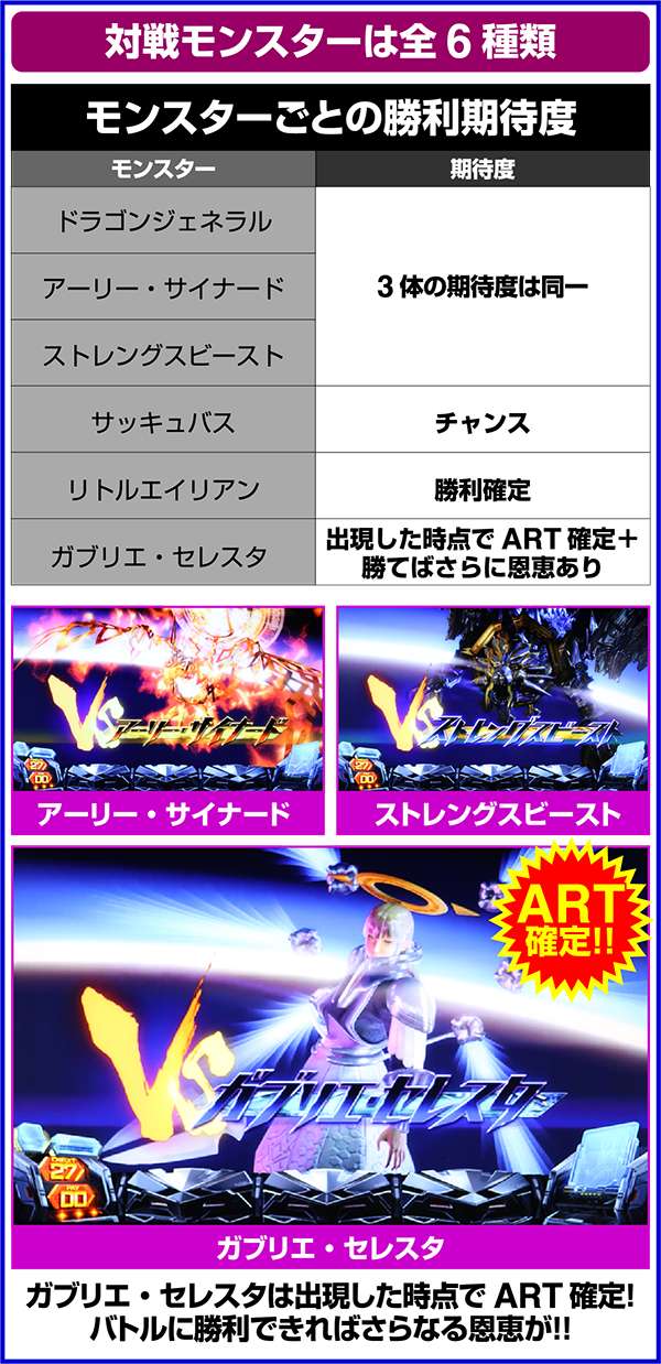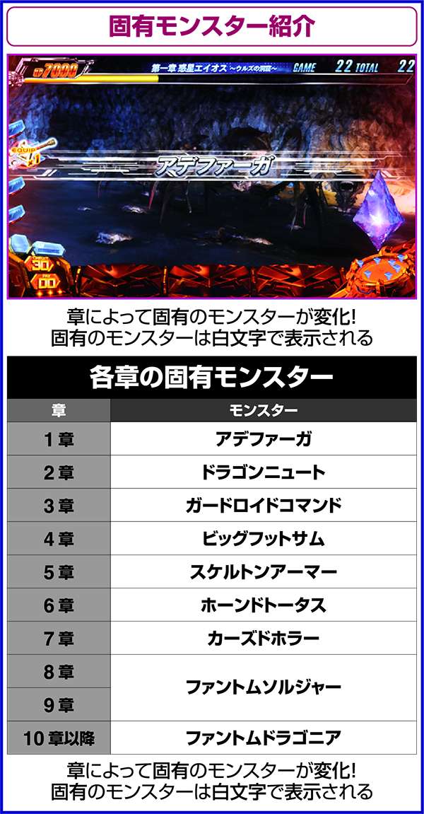 ボーナスでモンスターに勝利したあとはBIG・REG共通でART中と同様の上乗せ抽選をおこなう。理想は強レア役で勝利することだが、早めに勝利した場合でも上乗せのチャンスがあるところはうれしいポイントといえる。