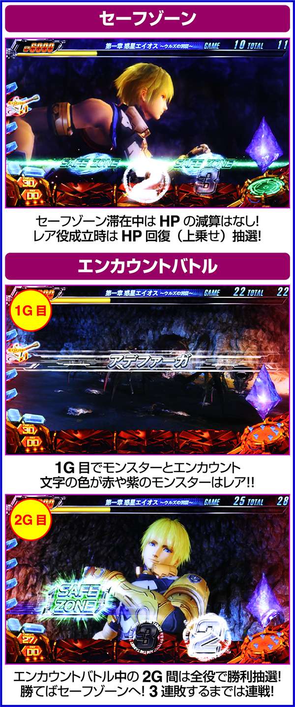各章開始時は上記の抽選がおこなわれず、セーフゾーンは10G固定。