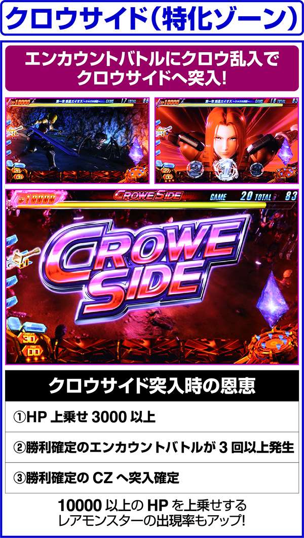 クロウサイド中は、バトルに敗北するたびに保証回数を使用し、保証回数が0になった時点で勝利確定のCZへ突入する。