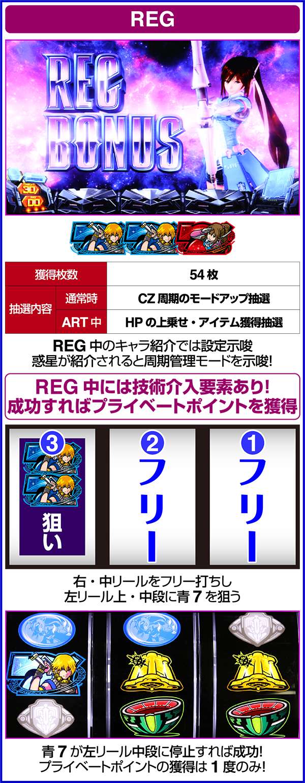 プライベートポイントを獲得できるのは1度のREGにつき1回のみとなっており、成功後は逆押しフリー打ちでOK。なお、目押しの成否で獲得枚数に差は出ないので積極的に挑戦しよう。