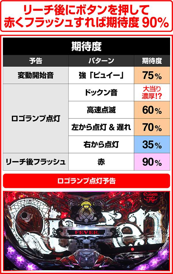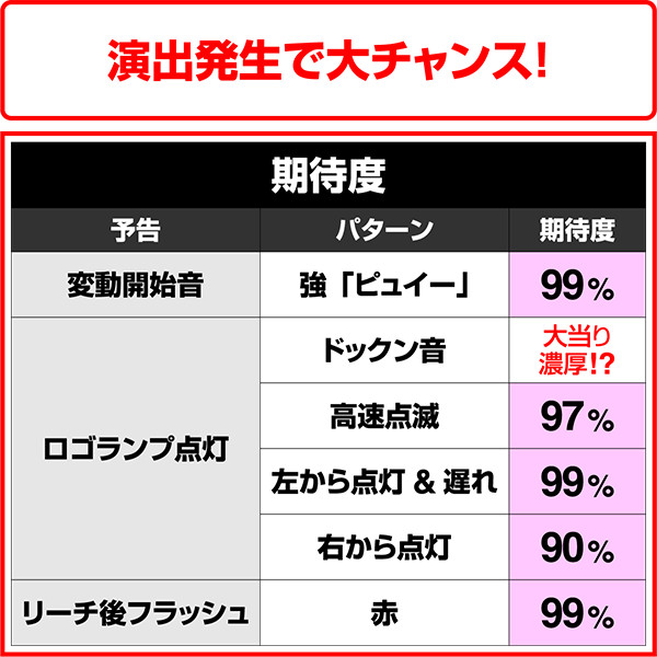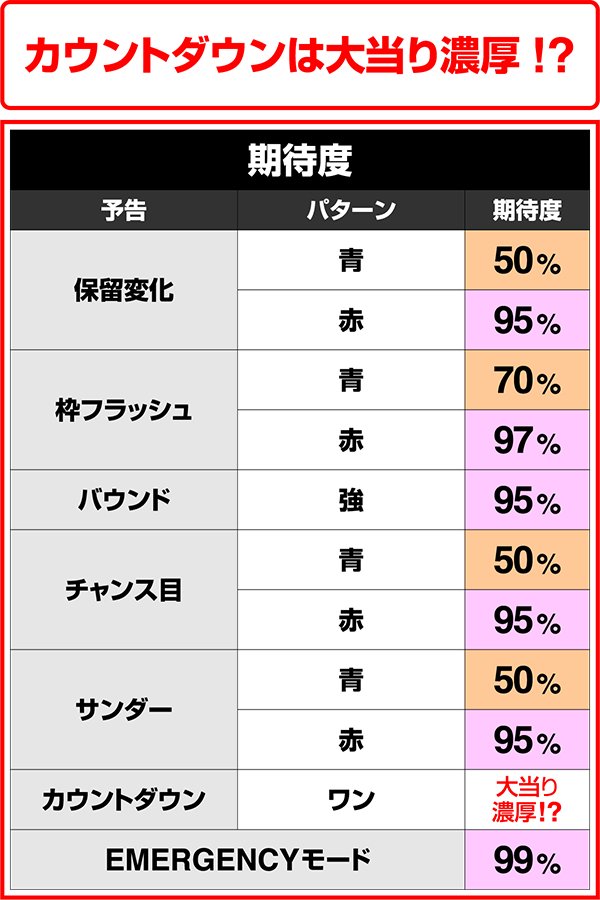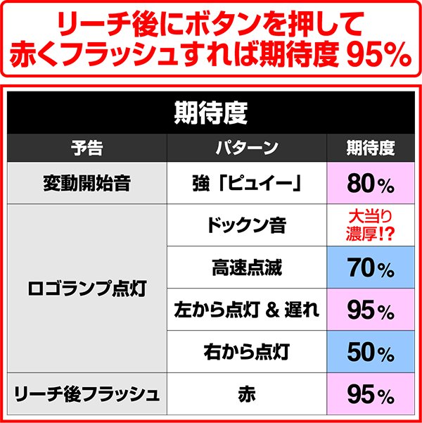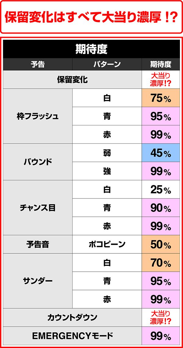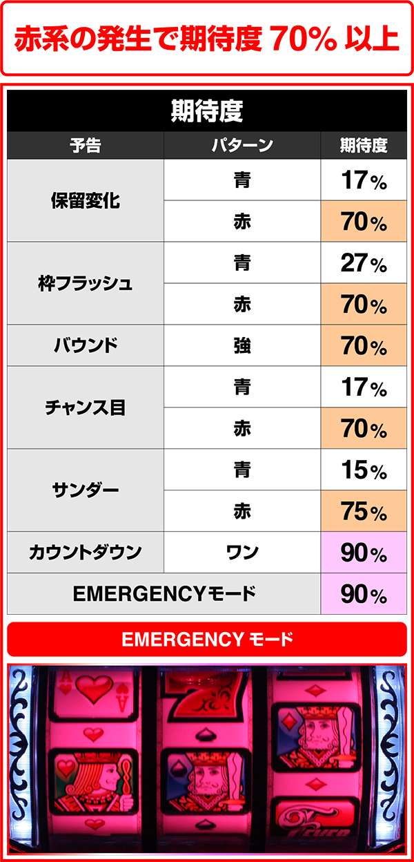枠フラッシュ予告は筐体の枠が光り、サンダー予告は全絵柄停止時に盤面全体が光る。どちらも赤く光れば期待度70%となる。