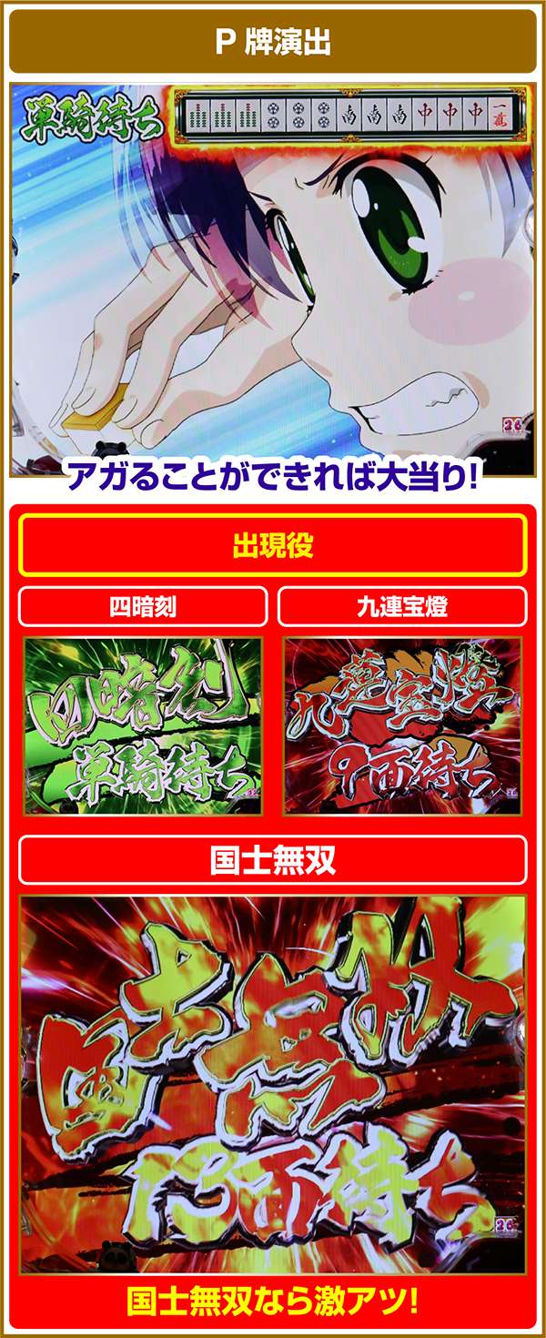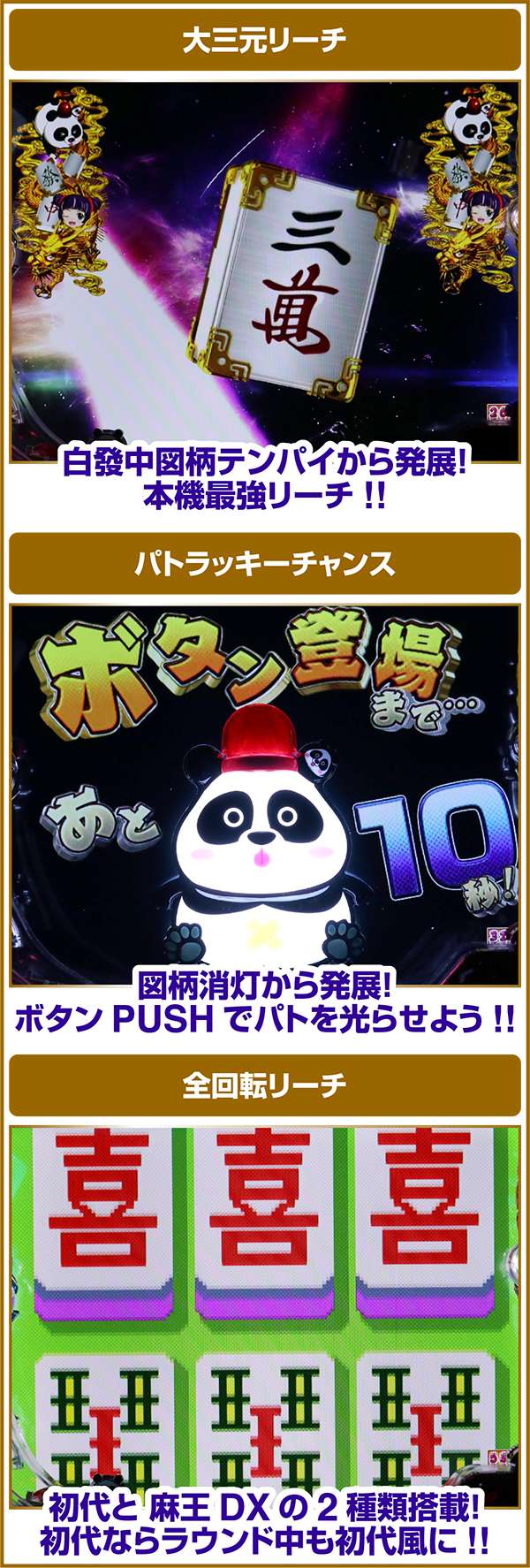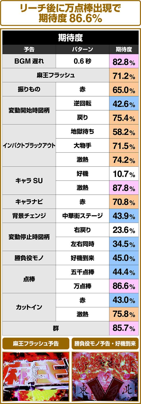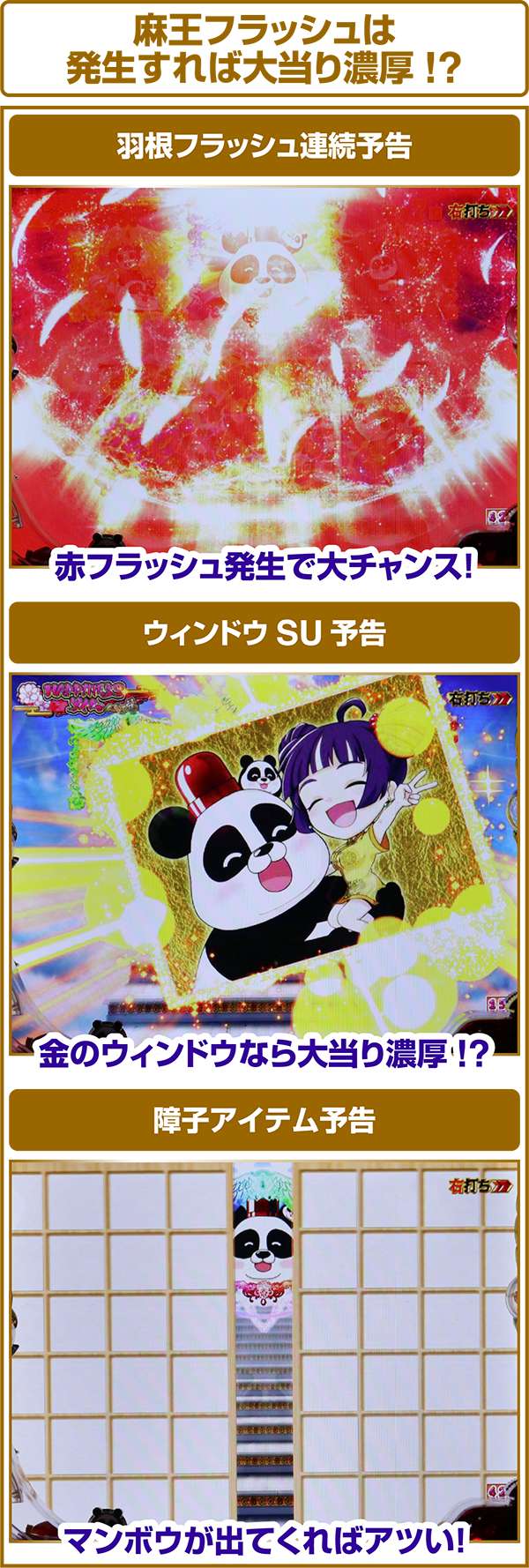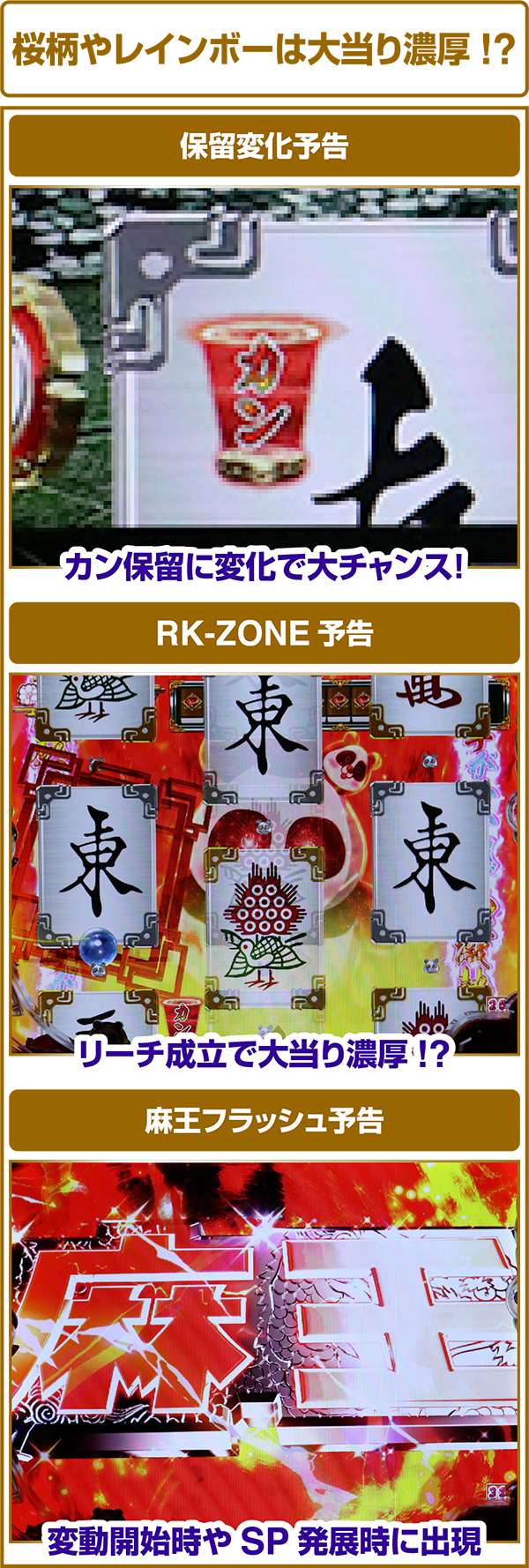 PK-ZONE予告は図柄の下にある水晶からイナズマが発生すれば突入のチャンス。 麻王フラッシュは文字が逆さで出現すれば大当り濃厚!? テンパイ後点棒予告は5千点棒でもアツい。
