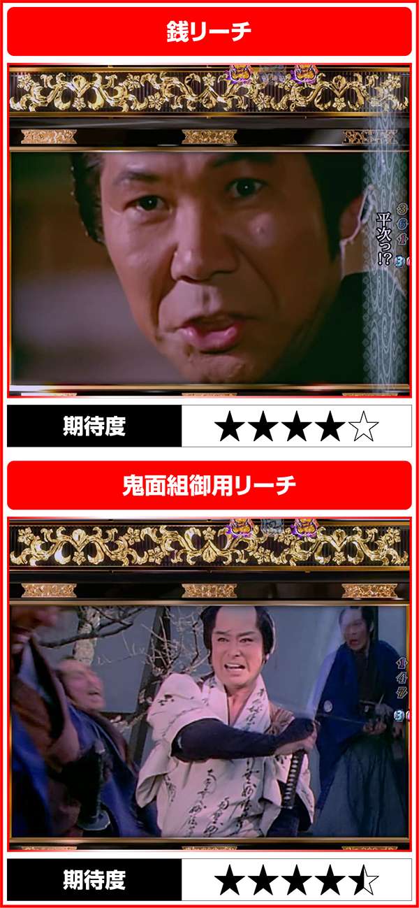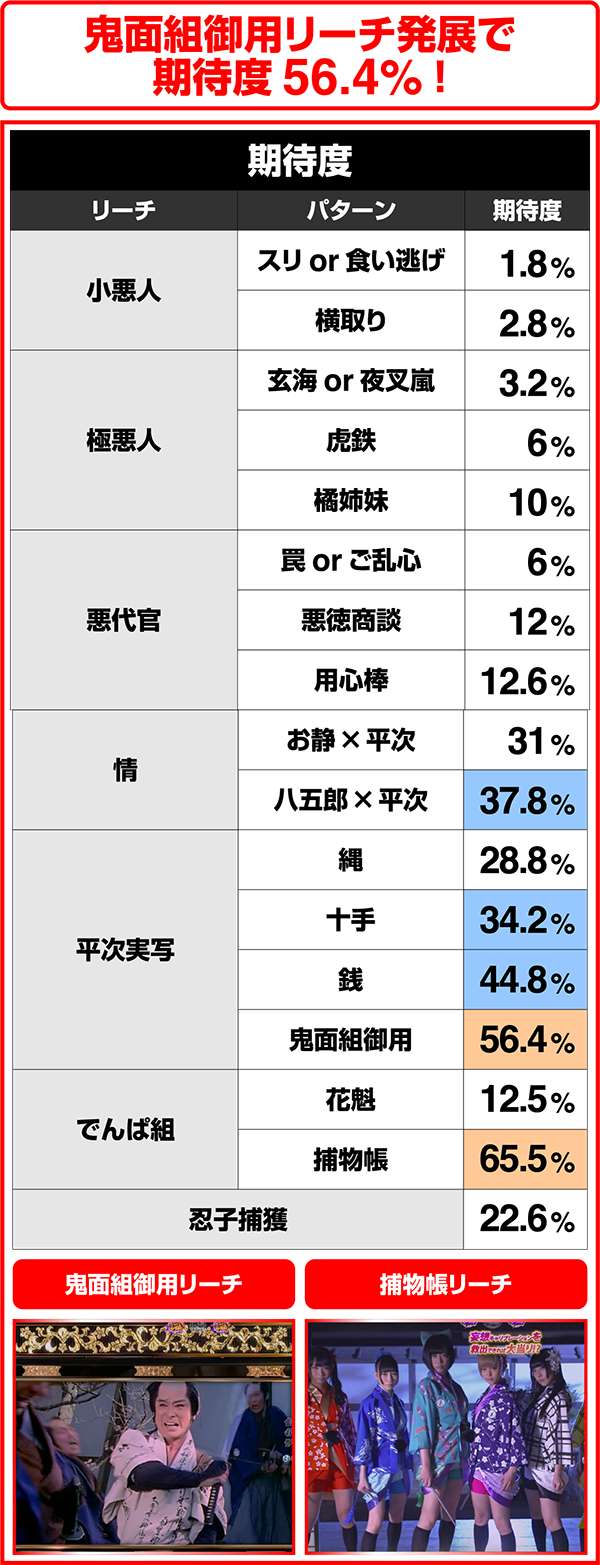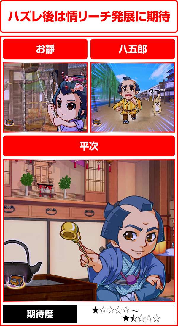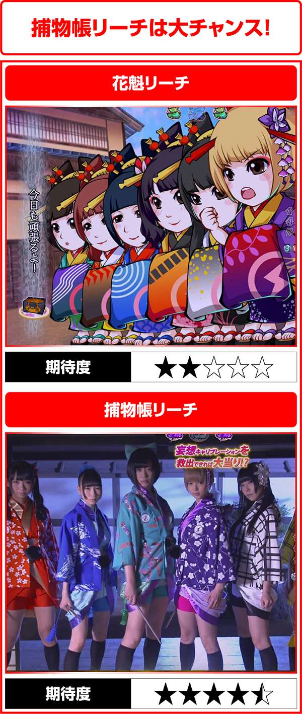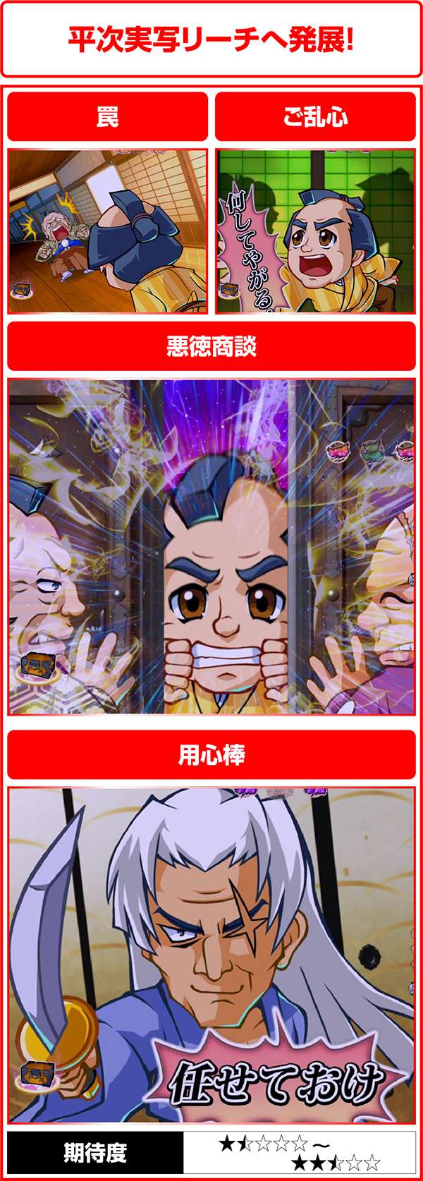 キャラリーチは情リーチへ、小悪人リーチは銭形チャンスへ、極悪人と悪代官リーチは平次実写リーチへ、花魁リーチは捕物帳リーチへ発展の可能性があるぞ。