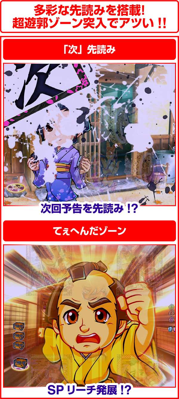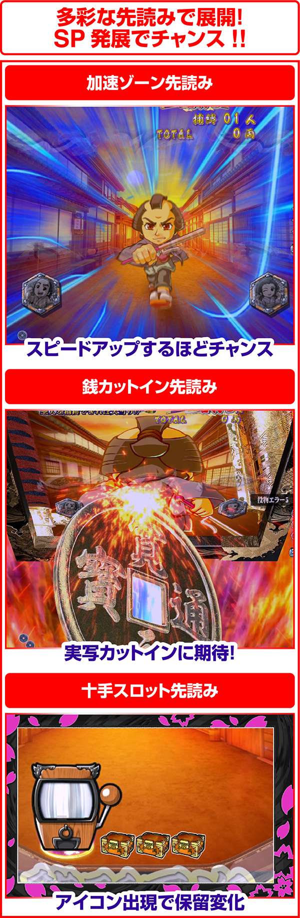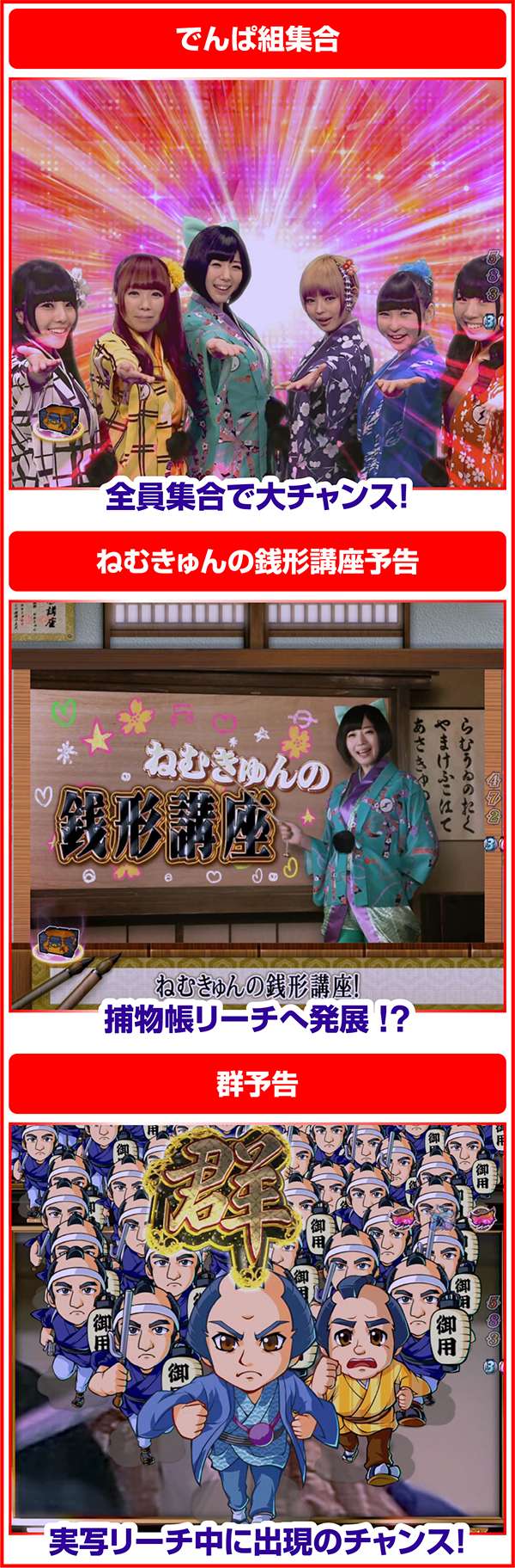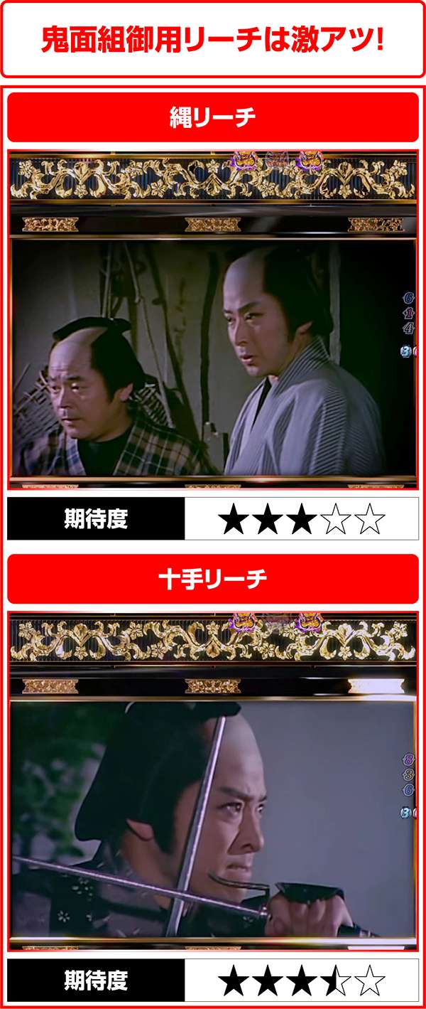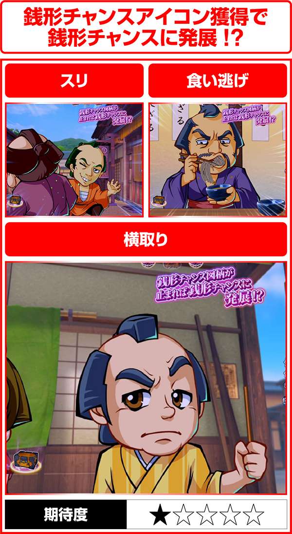 キャラリーチは情リーチへ、小悪人リーチは銭形チャンスへ、極悪人と悪代官リーチは平次実写リーチへ、花魁リーチは捕物帳リーチへ発展の可能性があるぞ。