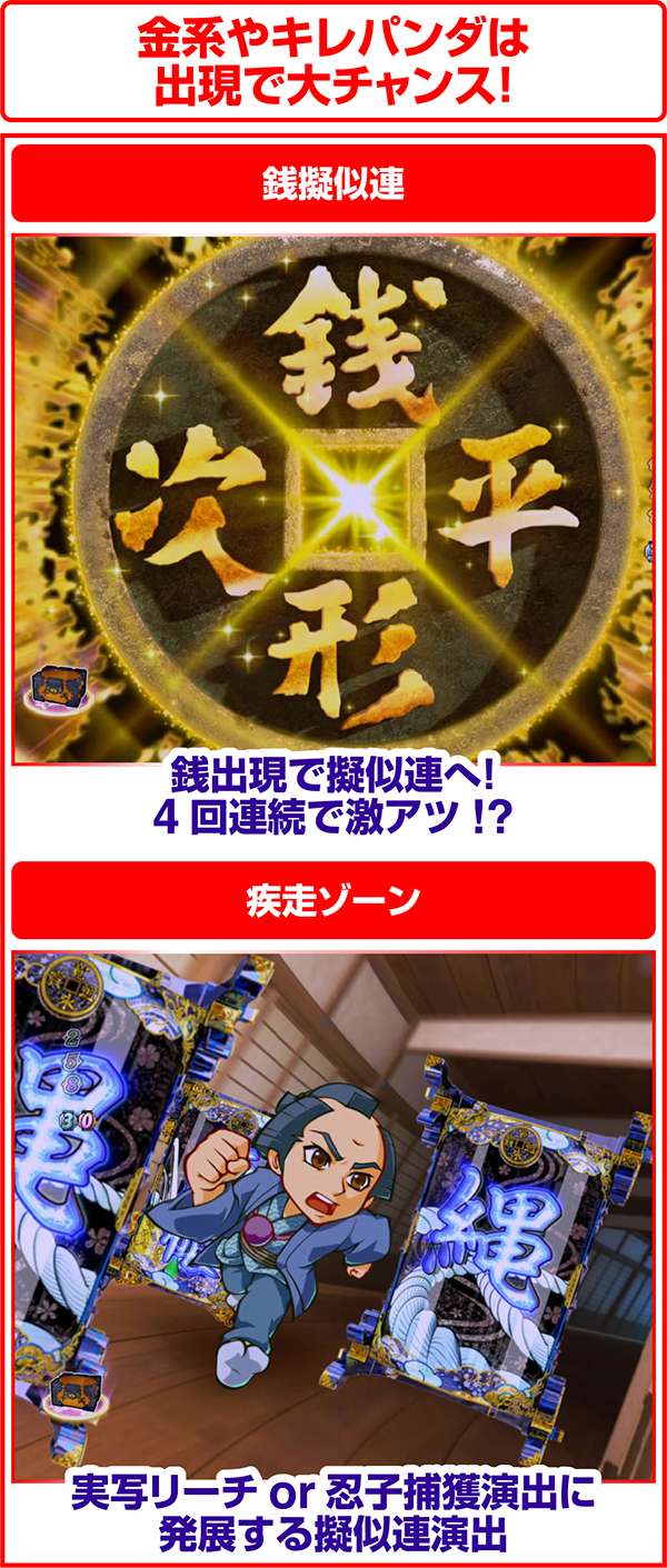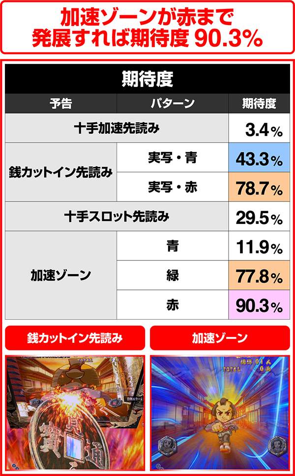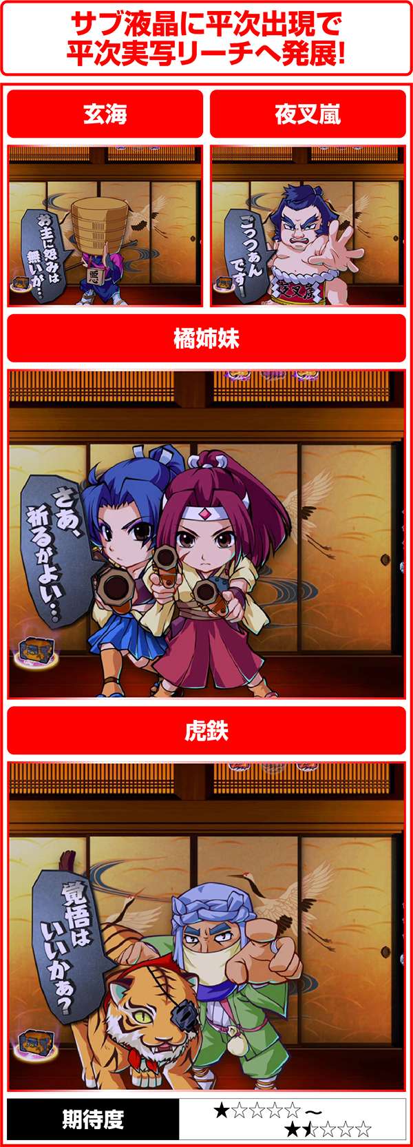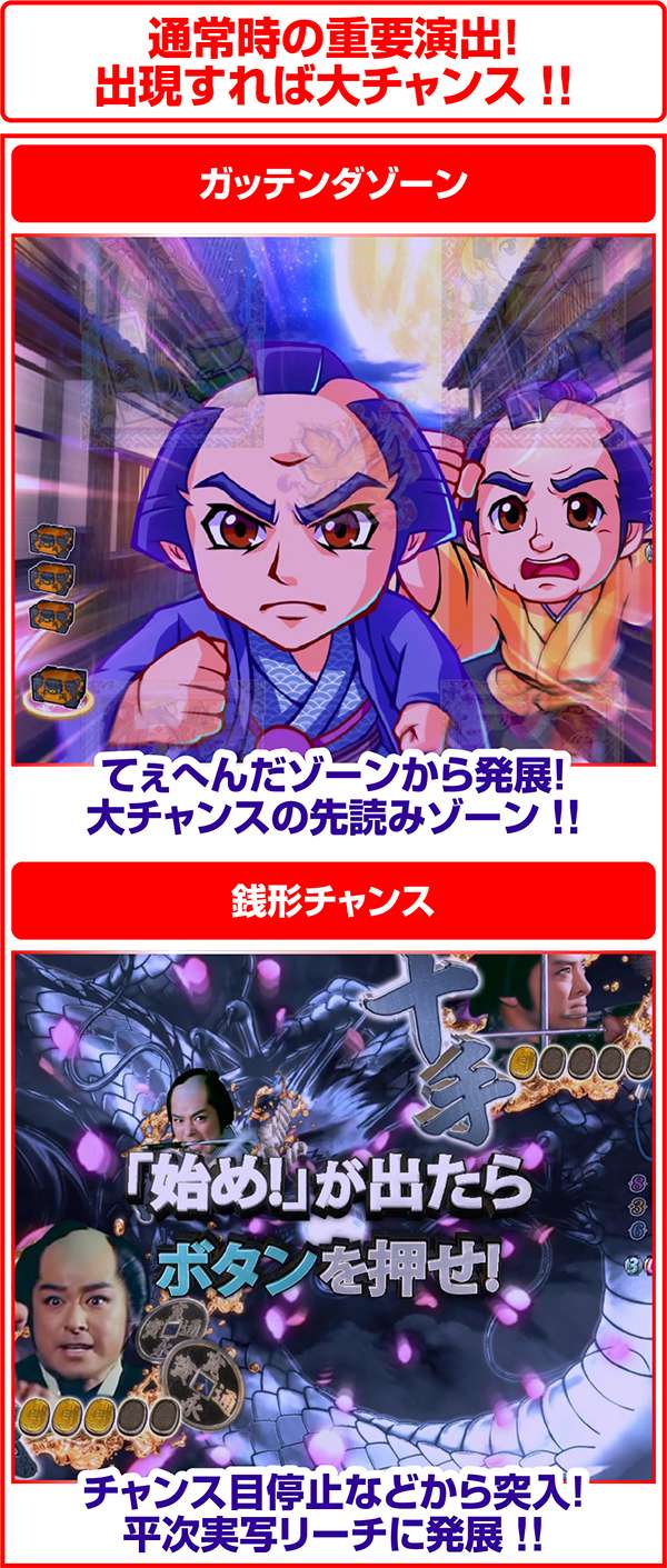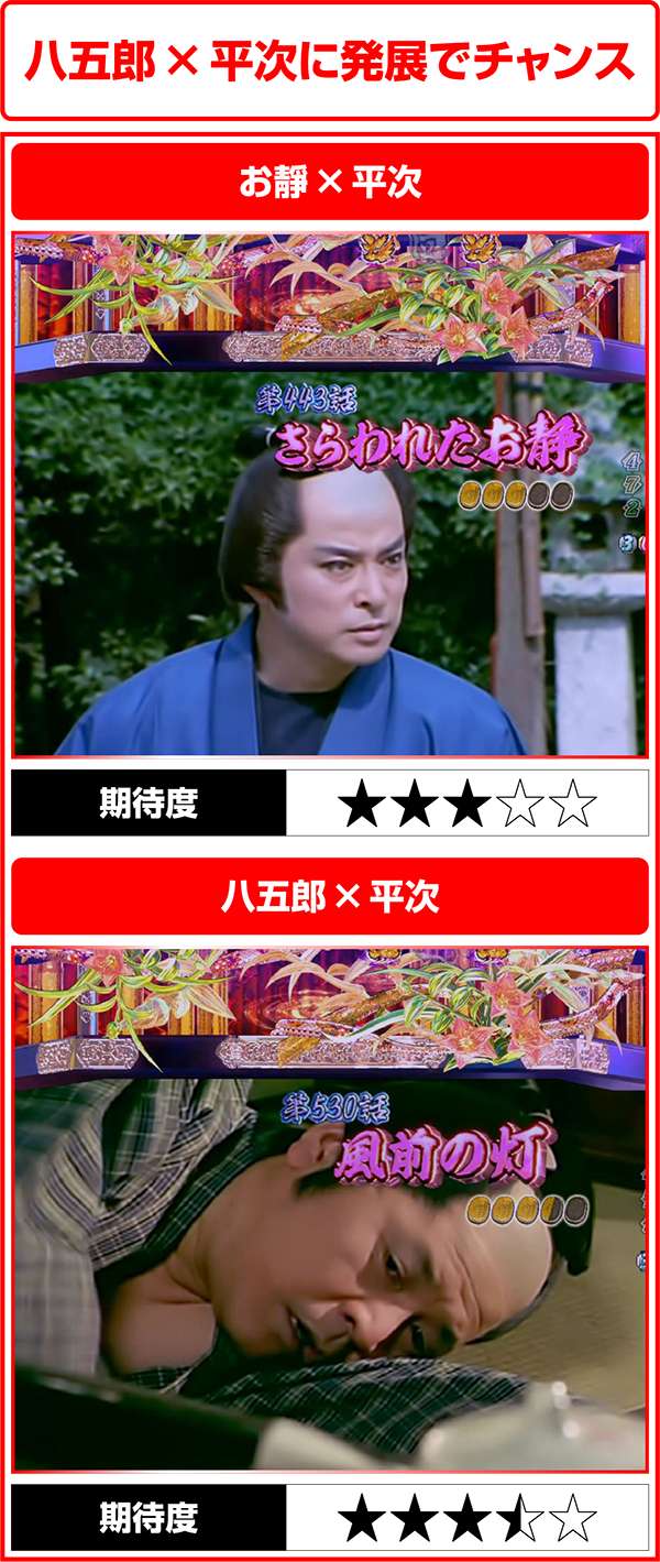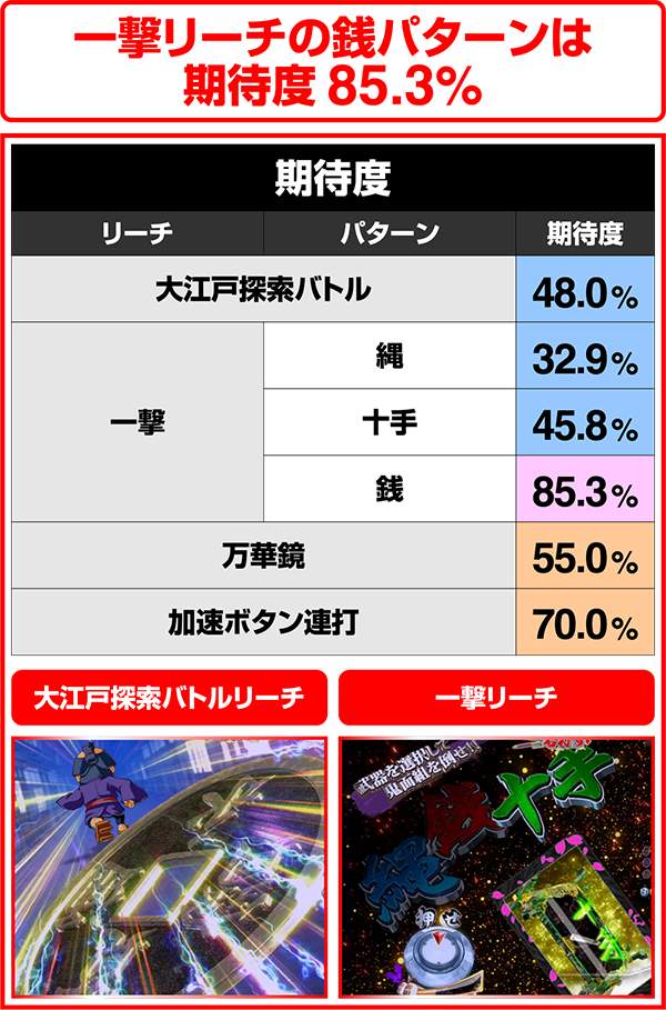 キャラリーチは情リーチへ、小悪人リーチは銭形チャンスへ、極悪人と悪代官リーチは平次実写リーチへ、花魁リーチは捕物帳リーチへ発展の可能性があるぞ。