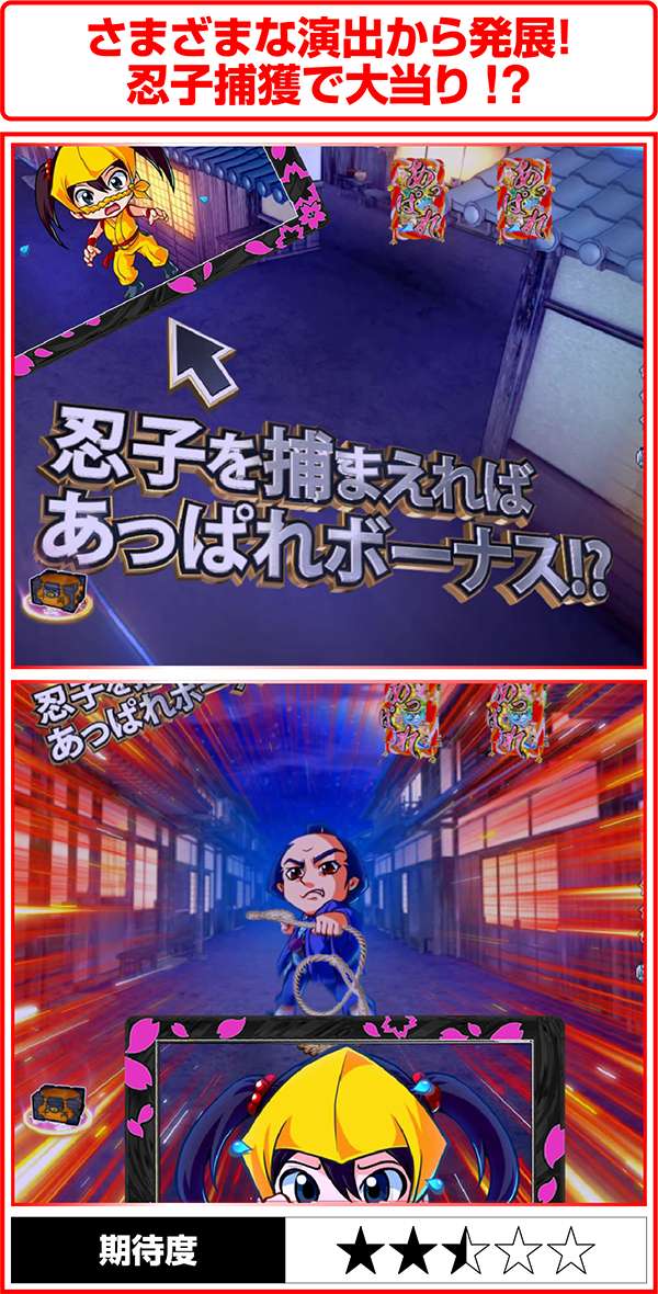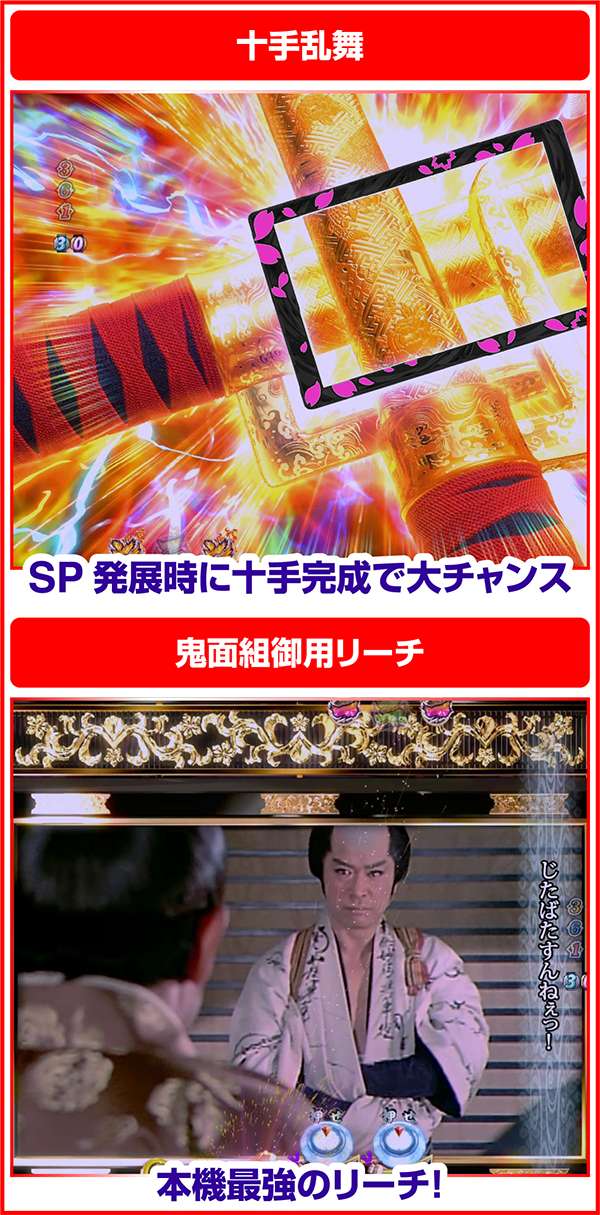 SP発展時に十手乱舞発動から発展。発展演出は縄→十手→銭→鬼面組の順に画面が進んでいき、進むほど期待度が高くなる。