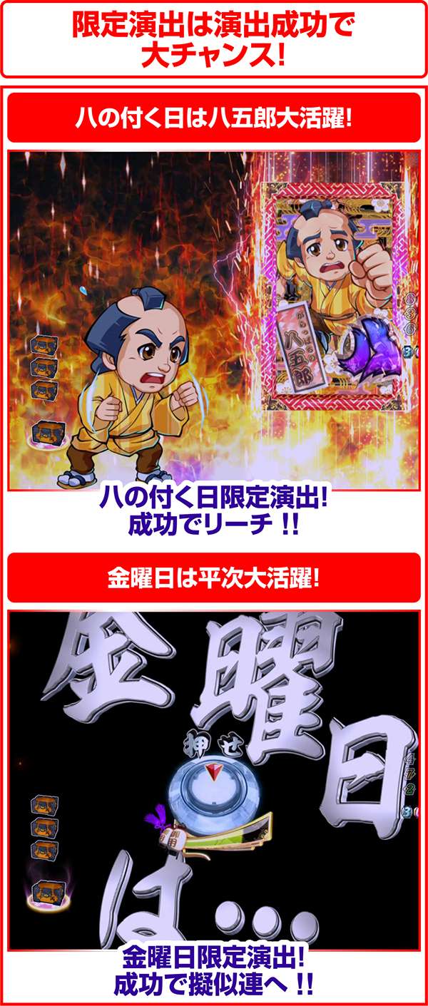 本機には日付や曜日によって出現する演出が搭載されている。いずれも演出成功で大チャンスだ!