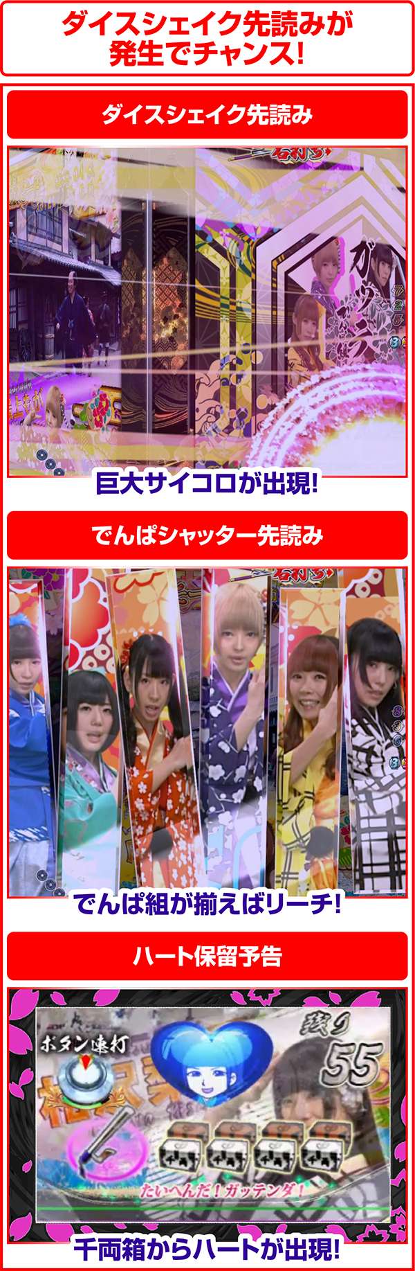 ライトミドルに近い大当り確率にST突入率100%と遊びやすい仕様。 約2240個獲得できる大当りを搭載と一撃性も兼ね備えている。 超巨大な大銭役モノや時代劇の王道を極めた液晶演出など銭形平次の世界観を取り入れた演出が満載。 また、人気アイドル「でんぱ組.inc」とコラボレーションをしており、予告やリーチなどさまざまな場面で活躍! |