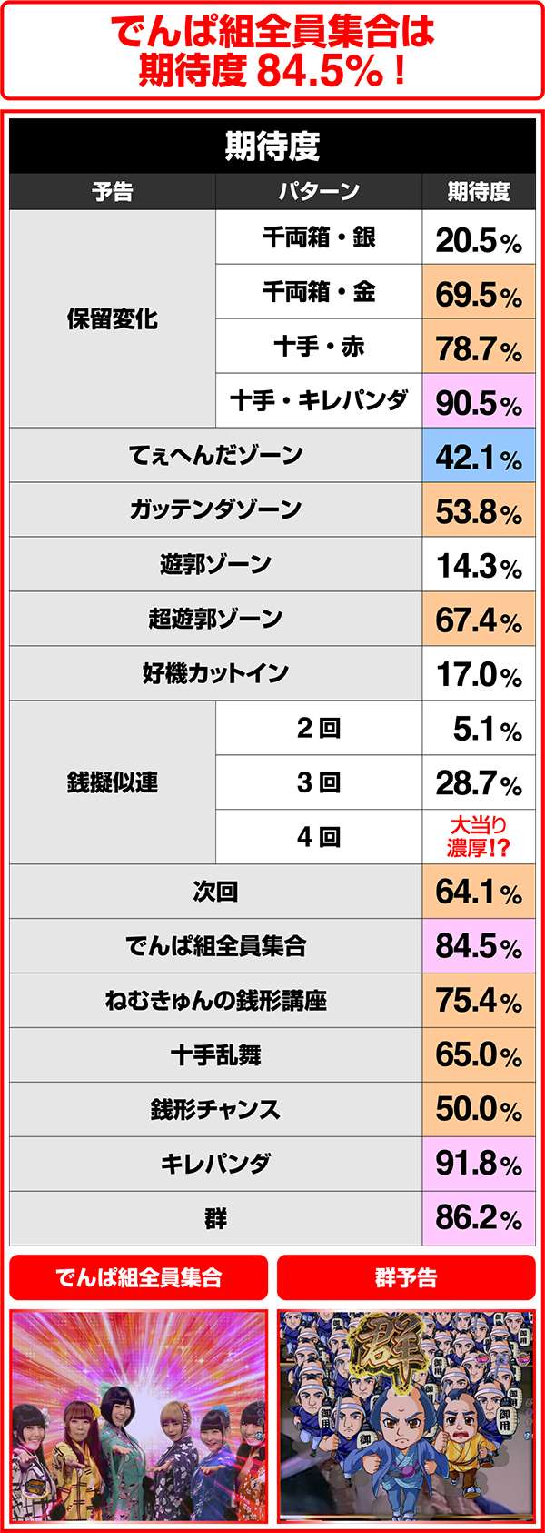 保留変化時は千両箱の色と中身に注目。色は通常<白<黒<金の順にアツくなる。中身は種類によって展開がことなり、御用保留なら小当り以上、煙管保留はSP発展濃厚、金曜日限定の銭金保留となっている。