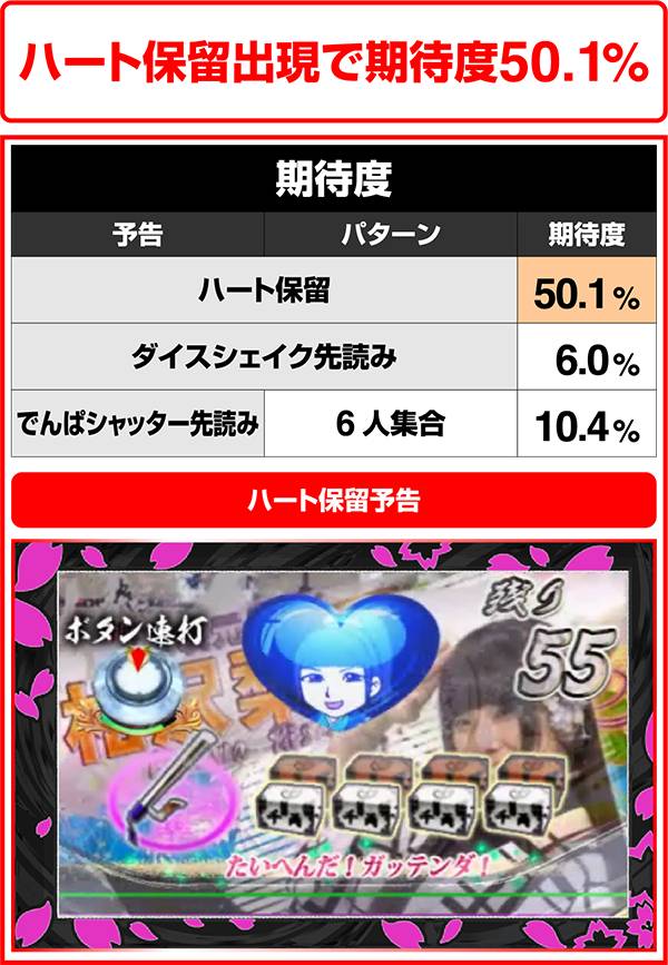 ハート保留予告は千両箱から出現。ハートの色は緑や赤に期待しよう。また、羽根の生えたピンクの千両箱はハート保留出現のチャンス!?