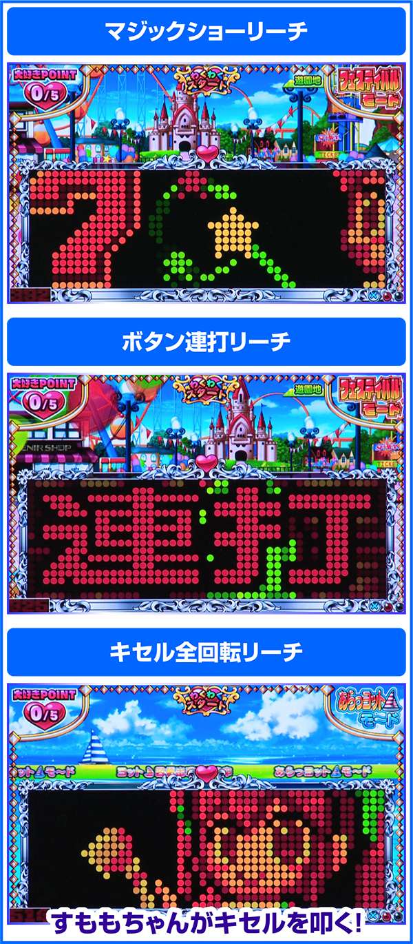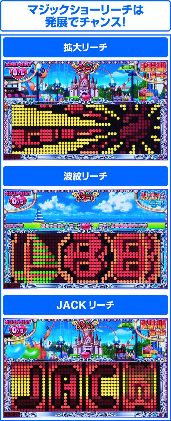 マジックショーリーチとボタン連打リーチは発展でチャンス。JACKリーチは3周目に発展でアツい!