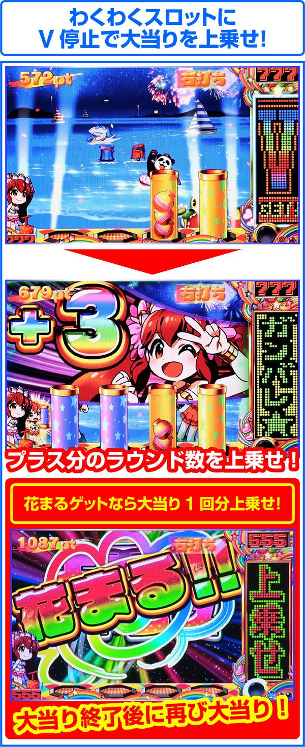 右スタートを通過するとわくわくスロットが回転。スロット部分にVが停止すれば上乗せとなり、花まる大当りをゲットできれば、大当り終了後に次の大当りが始まる。